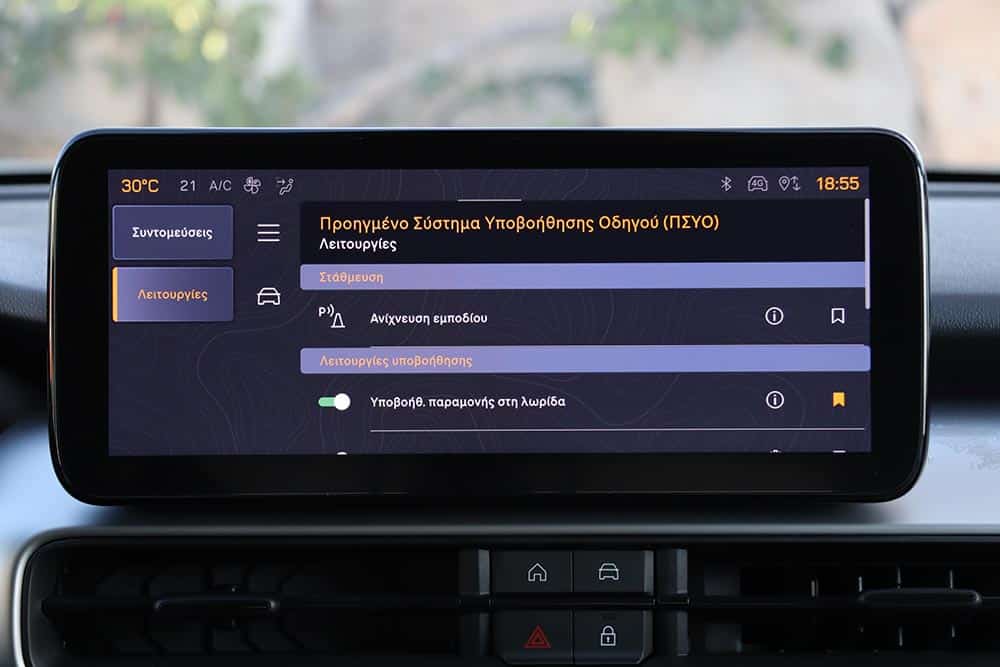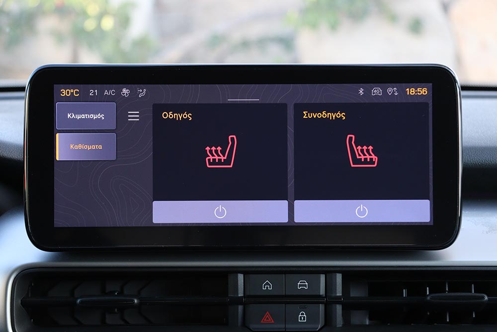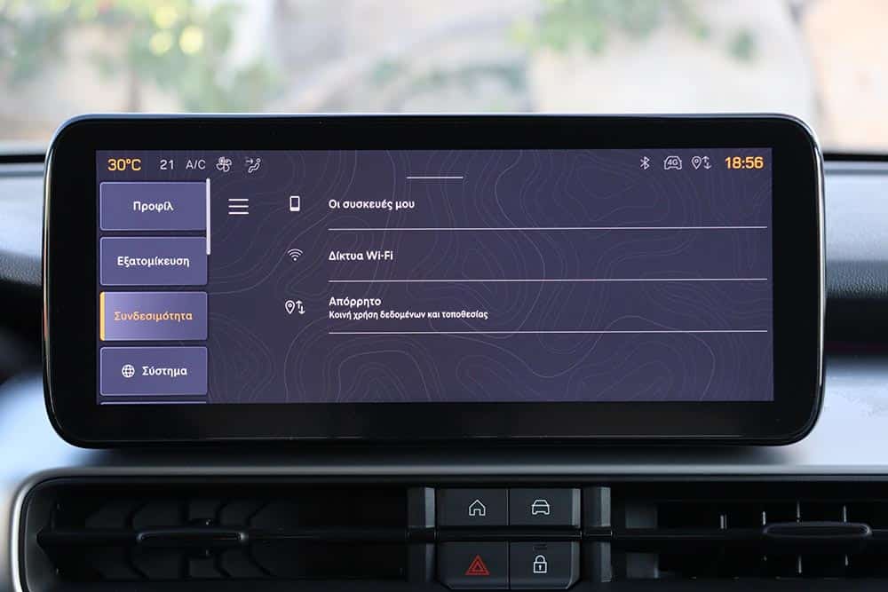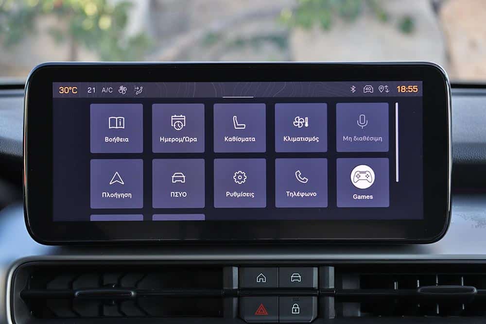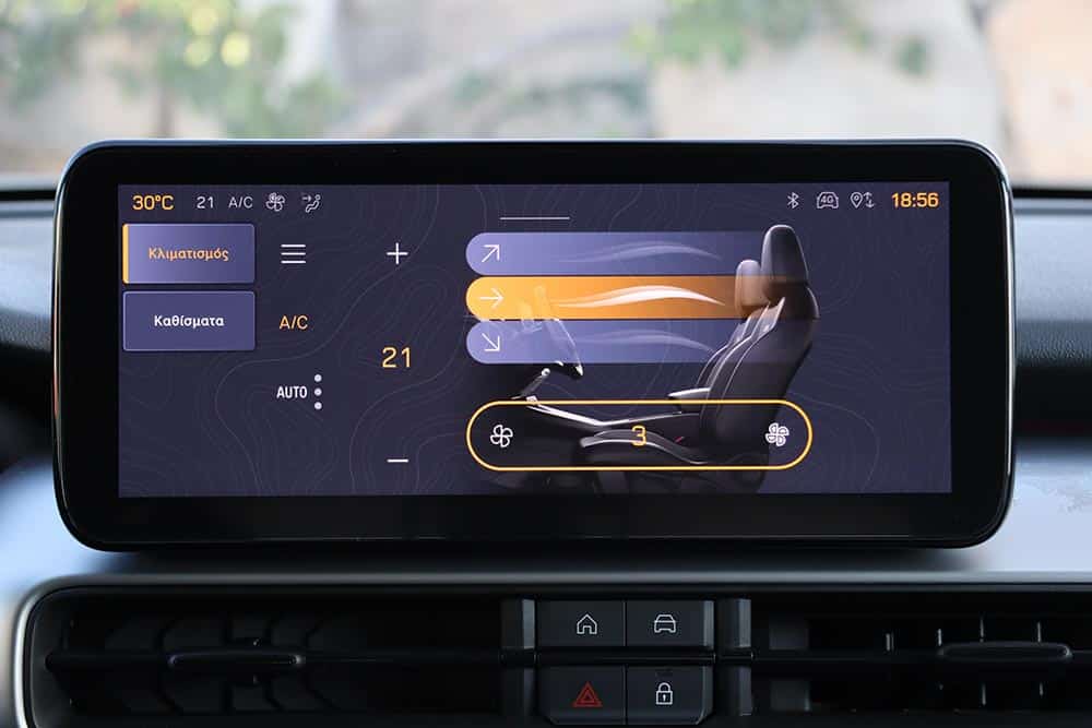Στο εσωτερικό, συναντάμε μίνιμαλ διάκοσμο, με ευθείες γραμμές και πολύ όμορφο και διακριτικό φωτισμό στα πλαϊνά του ταμπλό και πάνω από τους αεραγωγούς με μια ρίγα led. Στο κέντρο, δεσπόζει μια οθόνη αφής 10,25 ιντσών Uconnect για το infotainment, με τον πολύ ευκρινή ψηφιακό πίνακα οργάνων να είναι 7 ιντσών στην πρώτη έκδοση και 10,25 ιντσών στις υπόλοιπες. Κάτω από την κεντρική οθόνη υπάρχει ένα ιδιαίτερα βολικό ράφι για μικροαντικείμενα που φτάνει μέχρι το συνοδηγό. Ευτυχώς συναντάμε πληθώρα φυσικών διακοπτών για τις βασικές λειτουργίες και έτσι δεν χρειάζεται να ψάχνουμε σε μενού και υπομενού για τα στοιχειώδη. Ο παραδοσιακός λεβιές ταχυτήτων έχει δώσει τη θέση του σε μια αρκετά βαθιά και χρηστική θήκη, η οποία κλείνει με μαγνητικό καπάκι, όπως είναι στα tablets, έχοντας την επιλογή και της μερικής κάλυψης, για την τοποθέτηση π.χ. ενός ψηλού θερμός. Ακριβώς πίσω βρίσκεται μια ρυθμιζόμενη ποτηροθήκη που όμως δεν έχει και την πιο βολική διάταξη. Τέλος, συναντάμε θήκες στα πλαϊνά μέρη της πόρτας αλλά και το υποβραχιόνιο. Τα πλαστικά μέρη στην καμπίνα είναι σκληρά αλλά η συναρμογή είναι αρκετά καλή.
