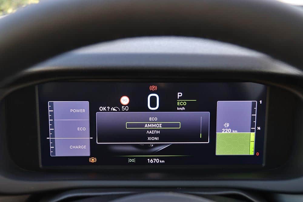 Το Jeep Avenger e-Hybrid χρησιμοποιεί ένα αποδοτικό υβριδικό σύστημα που λειτουργεί σε τάση 48V και αποτελείται από έναν 3κύλινδρο 1.200άρη turbo κινητήρα βενζίνης με 100 PS και 205 Nm ροπής, ηλεκτρικό κινητήρα ισχύος 28 PS, που είναι ενσωματωμένος στο διπλού συμπλέκτη αυτόματο κιβώτιο 6 σχέσεων (e-DCT6), καθώς και μπαταρία χωρητικότητας 0,9 kWh. Η μπαταρία, σε συνδυασμό με τον ηλεκτροκινητήρα, εξασφαλίζουν αμιγώς ηλεκτρική κίνηση που δεν ξεπερνά το 1 χλμ. με ταχύτητες που δεν υπερβαίνουν τα 30 χλμ./ώρα. Λόγω όμως του ότι συνεχώς αυτοφορτίζεται, διανύονται πολλά περισσότερα χιλιόμετρα ειδικά σε ήπιους ρυθμούς. Αποδεικνύεται στην πράξη πολύ ελαστικός, ενώ τραβάει από χαμηλά χωρίς να σε κουράζει, ακόμα και στο Normal mode. Το 0-100 χλμ./ώρα έρχεται σε 10,6 δλ. με τις συνολικές επιδόσεις να είναι αρκετά καλές για τα 1.280 κιλά του αμαξώματος, με την τελική ταχύτητα να αγγίζει τα 184 χλμ./ώρα. Η διαφορά στη μέση κατανάλωση φτάνει στο 13% σε σύγκριση με το Avenger αμιγώς βενζίνης 1.2Τ 100 hp, ενώ αγγίζει το 28% σε αστικό περιβάλλον. Μιλώντας για κατανάλωση, αυτή βρέθηκε στην πράξη κοντά στα 7,0 λίτρα/100 χλμ., με τον κλιματισμό να δουλεύει ασταμάτητα. Στην περίπτωση που αποφασίσεις να πιέσεις ή να κινηθείς για αρκετά χιλιόμετρα εκτός δρόμου θα δεις την ένδειξη στο trip να σκαρφαλώνει και πάνω από τα 9 λίτρα/100 χλμ.