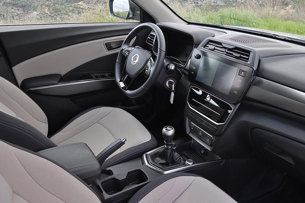 «Πρώην SsangYong» είπαμε; Με το που ανοίγεις την πόρτα, πάντως, το παλιό σήμα σε υποδέχεται! Πέρα από αυτό το οξύμωρο, η καμπίνα του Tivoli χαρακτηρίζεται από τη μοντέρνα προσέγγιση, όπως χρειάζεται σε κάθε καινούργιο αυτοκίνητο. Η οθόνη αφής των 9,0 ιντσών καταλαμβάνει το κέντρο του ταμπλό, ωστόσο άνετα θα μπορούσε να είναι μίνιμουμ μια ίντσα μεγαλύτερη αν αξιοποιούνταν το πολύ φαρδύ περίγραμμα. Ευχάριστη και εργονομική η παρουσία του περιστροφικού διακόπτη για την ένταση της φωνής, όχι τόσο εκείνη των πλήκτρων αφής για τον κλιματισμό. Ο ψηφιακός πίνακας οργάνων φτάνει τις 10,25 ίντσες και εντυπωσιάζει με τις επιλογές διαμόρφωσης, σε αντίθεση με το infotainment που πληροί τα απολύτως τυπικά σε θέμα γραφικών και διακόσμου.