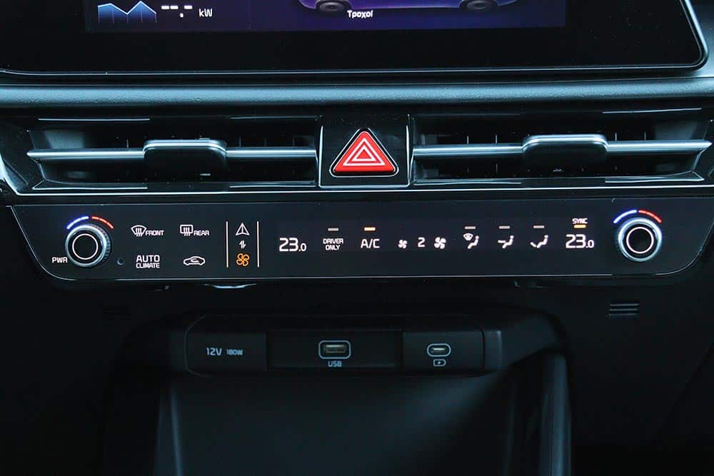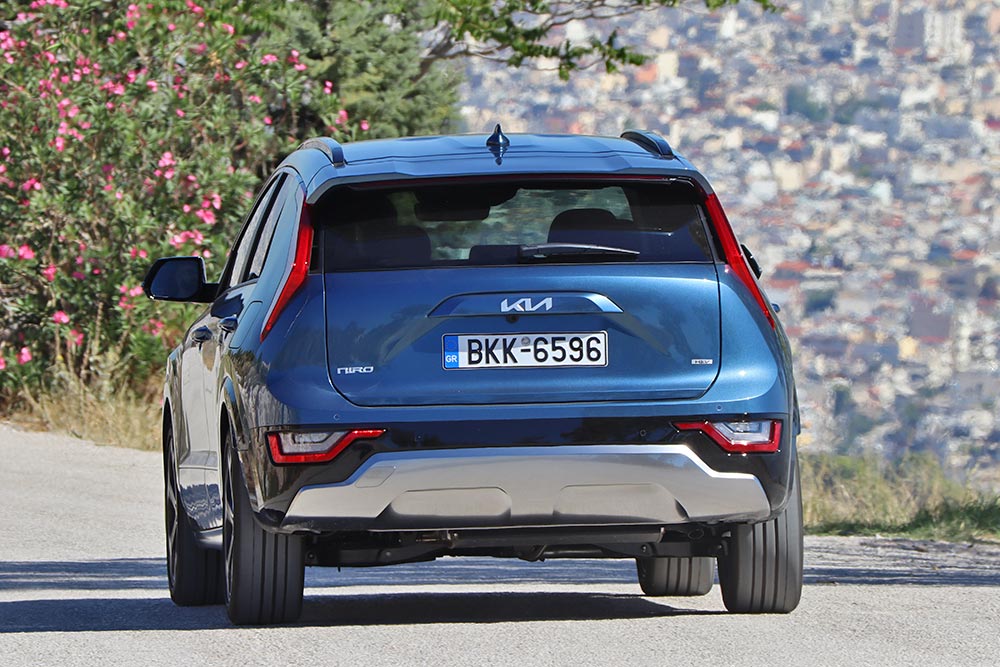 Στην κεντρική κονσόλα συναντάται το διαισθητικό χειριστήριο δύο λειτουργιών, που έχουμε δει στο EV6 και στο νέο Sportage. Ανάμεσα από τα εμπρός καθίσματα βρίσκεται το γνωστό επίσης πάνελ που ενσωματώνει και το περιστροφικό χειριστήριο για την επιλογή της μετάδοσης (R, N, D), δεδομένου ότι δεν υπάρχει Niro με χειροκίνητο κιβώτιο ταχυτήτων. Οι ψηφιακές δυνατότητες επίσης εντυπωσιάζουν, καθώς πέρα από την εύρεση σημείων ενδιαφέροντος στο σύστημα πλοήγησης (βενζινάδικα, σταθμοί μετρό, πάρκινγκ κλπ), η εφαρμογή Kia Connect προσφέρει μέχρι απομακρυσμένο έλεγχο λειτουργιών από το κινητό τηλέφωνο! Στα πρακτικά ζητήματα, η χορταστική παρουσία αφρώδους υλικού στο πάνω μέρος του ταμπλό, που επίσης ενστερνίζεται το μοτίβο «μπούμερανγκ», σε κερδίζει με την πρώτη επαφή. Το ίδιο και οι χώροι, οι οποίοι υποδέχονται στη θαλπωρή τους 5 επιβάτες χωρίς παράπονο, συν 451 λίτρα για τα μπαγκάζια τους. Χώρος που θα μπορούσε να ήταν ακόμα μεγαλύτερος, αν δεν «εισέβαλλαν» τόσο έντονα οι θόλοι.