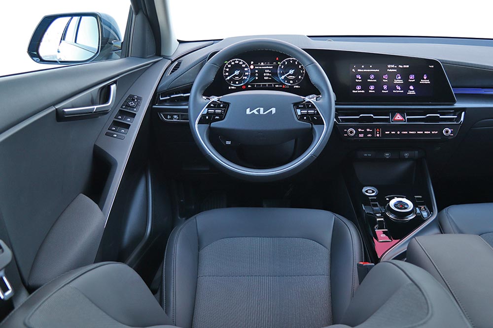 Προχωρώντας στα ενδότερα του νέου Kia, παρατηρείς μονομιάς τρία βασικά στοιχεία: η high tech προσέγγιση, ποιότητα και χώρους. Πριν καν καθίσεις στη θέση του οδηγού ή κάποια άλλη, αντιλαμβάνεσαι πως οι τεχνικοί της κορεατικής φίρμας έχουν κάνει πολύ σοβαρή δουλειά με την καμπίνα του Niro. Το ενιαίο πάνελ πίνακα οργάνων και infotainment είναι προαιρετικό (από την έκδοση Titanium και πάνω), αλλά πρακτικά απαραίτητο για να αποτυπώσει την ψηφιακότητα του νέου Niro. Ο ψηφιακός πίνακας οργάνων των 10,25 ιντσών έχει ακριβώς δίπλα του το infotainment, επίσης με 10,25 ίντσες, προσφέροντας πλούσια πληροφόρηση και καλοσχεδιασμένα γραφικά. Η πολυπλοκότητα θα μπορούσε να εμφανίζεται σε μικρότερο βαθμό, καθώς απαιτείται μπόλικη περιήγηση στο μενού μέχρι να βρεις το δρόμο σου και, πρακτικά, σε αναγκάζει να ψάχνεις ό,τι θες όποτε το αυτοκίνητο είναι ακινητοποιημένο.
