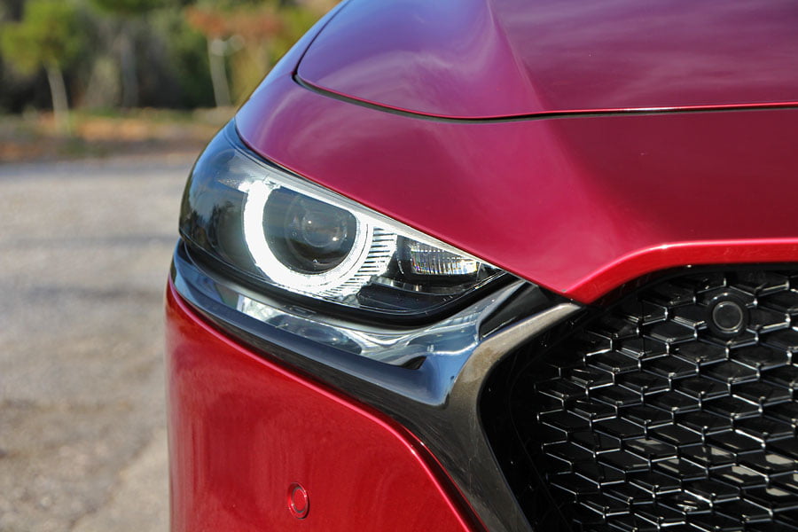 Ακόμα και να μην ήταν σπάνιο θέαμα στους δρόμους μας, το Mazda3 δεν υπάρχει περίπτωση να μην γύρναγε κεφάλια. Η σχεδιαστική φιλοσοφία «Kodo» τραβάει τα βλέμματα με το μακρύ καπό και τα λεπτά φωτιστικά σώματα να δημιουργούν ένα έντονα αιχμηρό εμπρός μέρος. Στο πλάι η γραμμή των παραθύρων ανεβαίνει προς το πίσω μέρος, συναντώντας την καμπύλη της οροφής και συνθέτοντας ένα προφίλ που παραπέμπει σε κουπέ.
