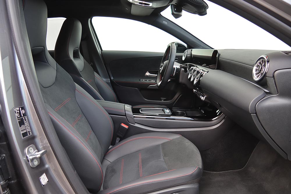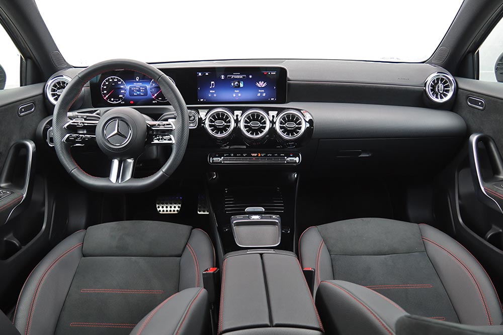 Εξίσου προσεκτικά κινήθηκε η Mercedes-Benz και στην καμπίνα, η οποία βρίθει ποιοτικών και premium αναφορών. Με το πακέτο AMG βέβαια αποκτάς ωραιότατα μπάκετ καθίσματα, κόκκινες ραφές και συνδυασμό suede-δερμάτινων επενδύσεων, αλλά τα μαλακά πλαστικά και η γεροδεμένη συναρμογή είναι στάνταρ. Το ίδιο ισχύει για το δίδυμο των οθονών 10,25 ιντσών, που είναι «όλα τα λεφτά» στην εικόνα του εσωτερικού και μέρος του βασικού εξοπλισμού.
