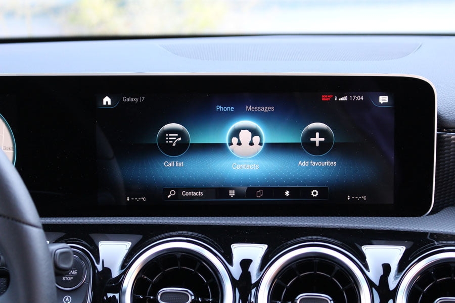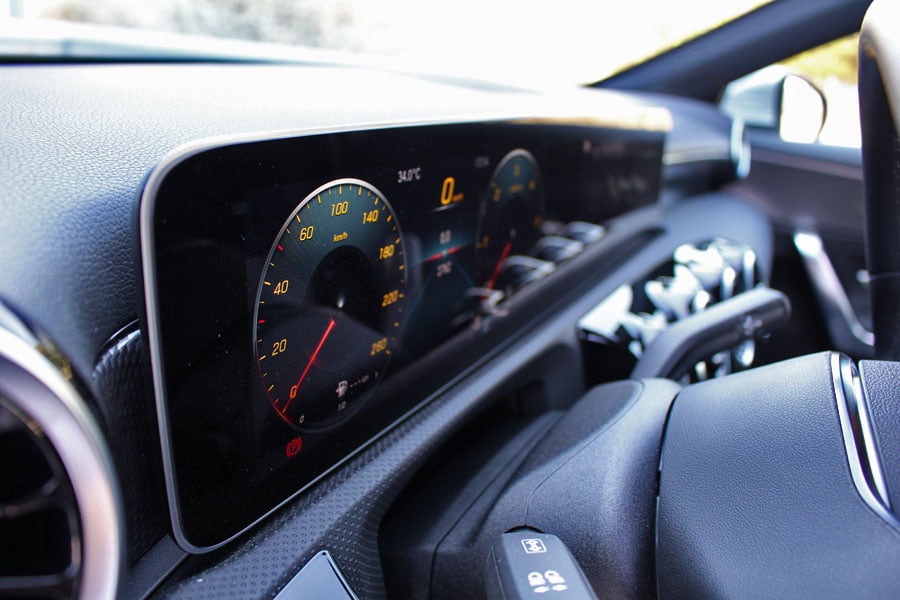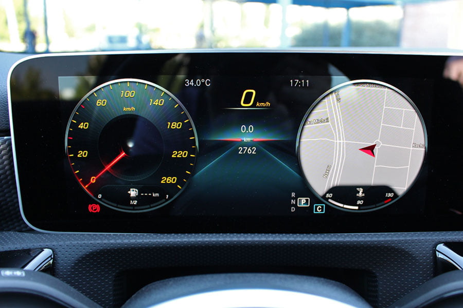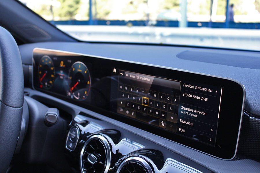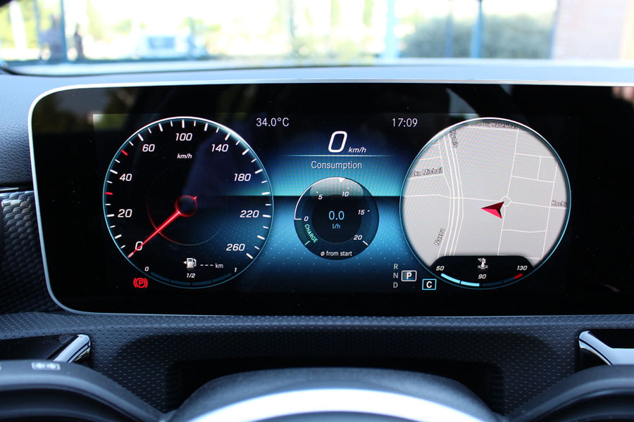 Στο θάλαμο των επιβατών της νέας A-Class τα βλέμματα πέφτουν αμέσως στις λεπτές μακρόστενες ψηφιακές οθόνες στο ταμπλό με τα εντυπωσιακά γραφικά, οι οποίες καταργούν πλήρως κάθε αναλογική ένδειξη. Ανάλογα την έκδοση υπάρχουν δύο οθόνες 7 ιντσών, μία οθόνη 7 ιντσών και μία 10,25 ιντσών ή δύο οθόνες 10,25 ιντσών. Ο χειρισμός των ενδείξεων του πίνακα οργάνων γίνεται μέσω των πλήκτρων αφής που υπάρχουν στην αριστερή πλευρά του τιμονιού και του συστήματος πολυμέσων με τα πλήκτρα στο δεξί μέρος του τιμονιού.