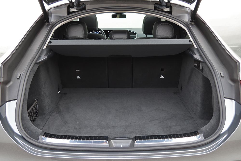 Η καμπύλη γραμμή της οροφής οδηγεί σε ένα μικρό spoiler στην πόρτα του πορτμπαγκάζ, η οποία χαρακτηρίζει τα γυμνασμένα μετόπισθεν της Γερμανίδας και οδηγεί το βλέμμα στις τραπεζοειδείς απολήξεις της εξάτμισης, αλλά και το διαχύτη, του προφυλακτήρα. Το παράστημα και ο όγκος της GLE Coupe είναι, δε, τέτοιος που κάνει ακόμα και τις -αεροδυναμικά σχεδιασμένες- 20άρες ζάντες να δείχνουν σχετικά μικρές, αν και εδώ παίζει επίσης ρόλο το μπόλικο 50άρι προφίλ των ελαστικών (275/50).