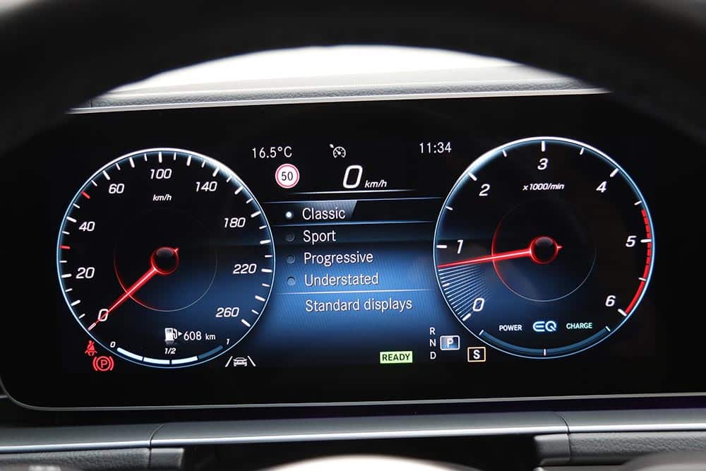 Σε άλλα νέα, το δέρμα και τα πολύ καλά υλικά καλύπτουν τα πάντα, έχοντας τις δυο οθόνες των 12,3 ιντσών (μια για τον πίνακα οργάνων, μια για το σύστημα πολυμέσων MBUX) να δίνουν τον ψηφιακό τόνο, με την απομίμηση αλουμινίου στους αεραγωγούς από κάτω να κάνουν το ίδιο για τις σπορ εκφάνσεις. Η εργονομία έχει κάποια θεματάκια, τόσο ως προς την πολυπλοκότητα του infotainment όσο και τη λειτουργία/τοποθέτηση κάποιων διακοπτών (πλήκτρα αφής στο τιμόνι και κλείδωμα/ξεκλείδωμα θυρών στο εσωτερικό της χειρολαβής αντίστοιχα), ενώ περιορισμένη είναι η ορατότητα προς τα πίσω. Στο παρκάρισμα δεν υπάρχει πρόβλημα, καθώς υπάρχουν κάμερες στις 360 μοίρες του αμαξώματος, όμως εν κινήσει αρκετές φορές βλέπεις πολύ λίγο το πίσω όχημα – ειδικά αν είναι κοντά και χαμηλό.