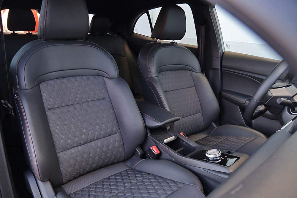 Από πλευράς ποιότητας υλικών, έχει γίνει ευρεία χρήση σκληρών πλαστικών στο ταμπλό, στα πάνελ των θυρών και σε διάφορες επιμέρους επιφάνειες. Τα νιώθεις γεροδεμένα, τα βλέπεις ότι δεν κάνουν «τσικ» όταν τα δοκιμάζεις, δεν τα ακούς να παράγουν τριγμούς όταν περνάς από ανωμαλίες. Μια μικρή μόνο λωρίδα στη μέση του ταμπλό είναι επενδυμένη με συνθετικό δέρμα, διακοσμημένο με πορτοκαλί ραφές. Αντίστοιχα υλικά συναντώνται στα καθίσματα, στα υποβραχιόνια των θυρών και στο κεντρικό υποβραχιόνιο. Πολύ καλή αίσθηση/εικόνα και από τον εύχρηστο περιστροφικό διακόπτη για το κιβώτιο ταχυτήτων.