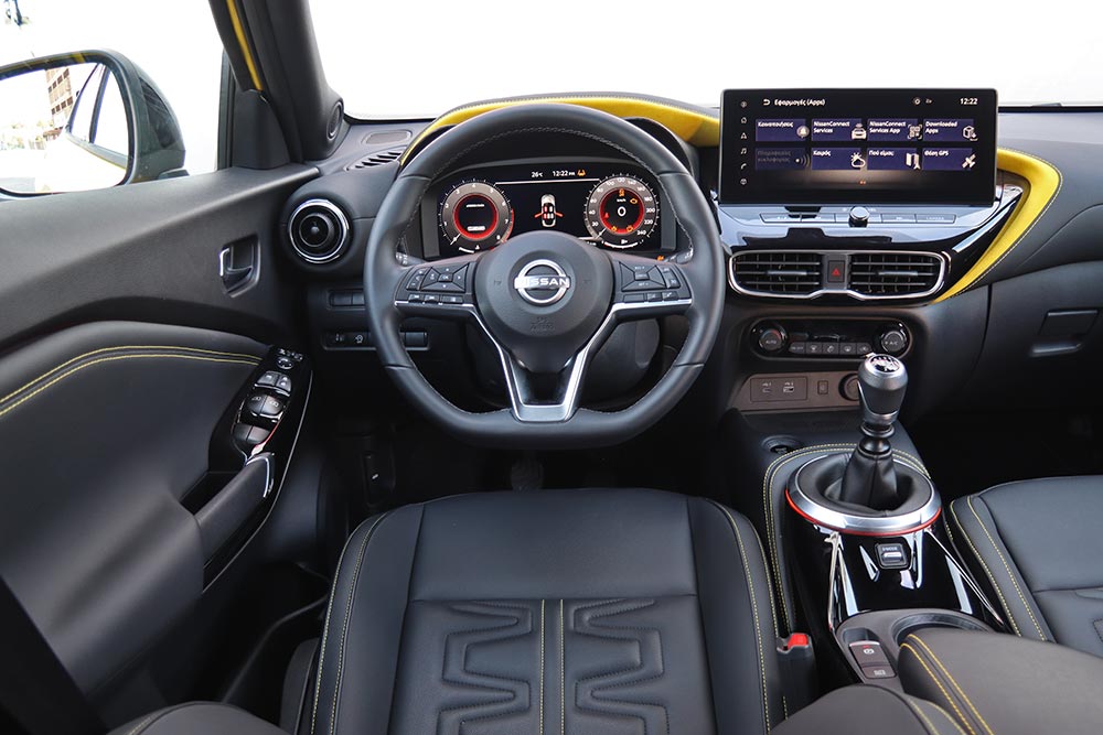 Οι μεγάλες αλλαγές απαντώνται στο εσωτερικό, όπου σχεδιαστές και τεχνικοί έδωσαν όλη τους την προσοχή. Η Nissan αναβάθμισε την ποιότητα και την υφή των υλικών, παντρεύοντας τα με δυο μεγάλες οθόνες για το ψηφιακό πίνακα οργάνων και το infotainment. Το ψηφιακό καντράν έκανε πρεμιέρα μάλιστα στο Juke, καθώς στο απερχόμενο δεν διατίθετο ούτε ως έξτρα. Τώρα τοποθετείται σε διάσταση 7 ιντσών στην έκδοση Connecta και 12,3 ιντσών από την N-Connecta και άνω με δυο διαφορετικά layout: ένα με την κλασική διάταξη στροφόμετρου-ταχύμετρου και τις λοιπές πληροφορίες ενδιάμεσα (Classic), κι ένα που δίνει περισσότερο χώρο στην απεικόνιση πληροφοριών σχετικά με το σύστημα πλοήγησης, το ηχοσύστημα, το trip computer κλπ (Enhanced).