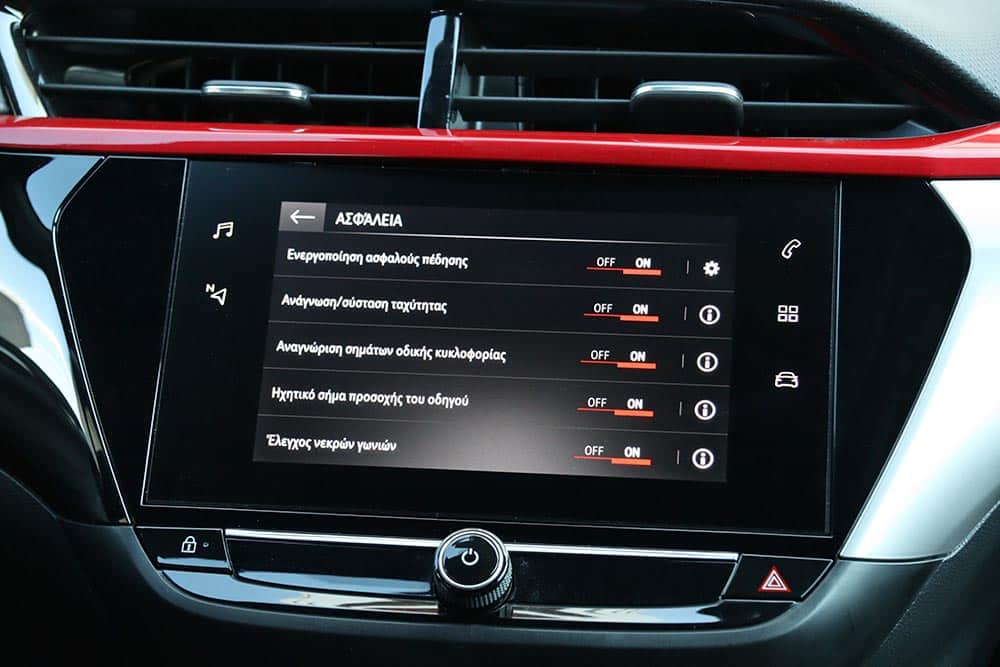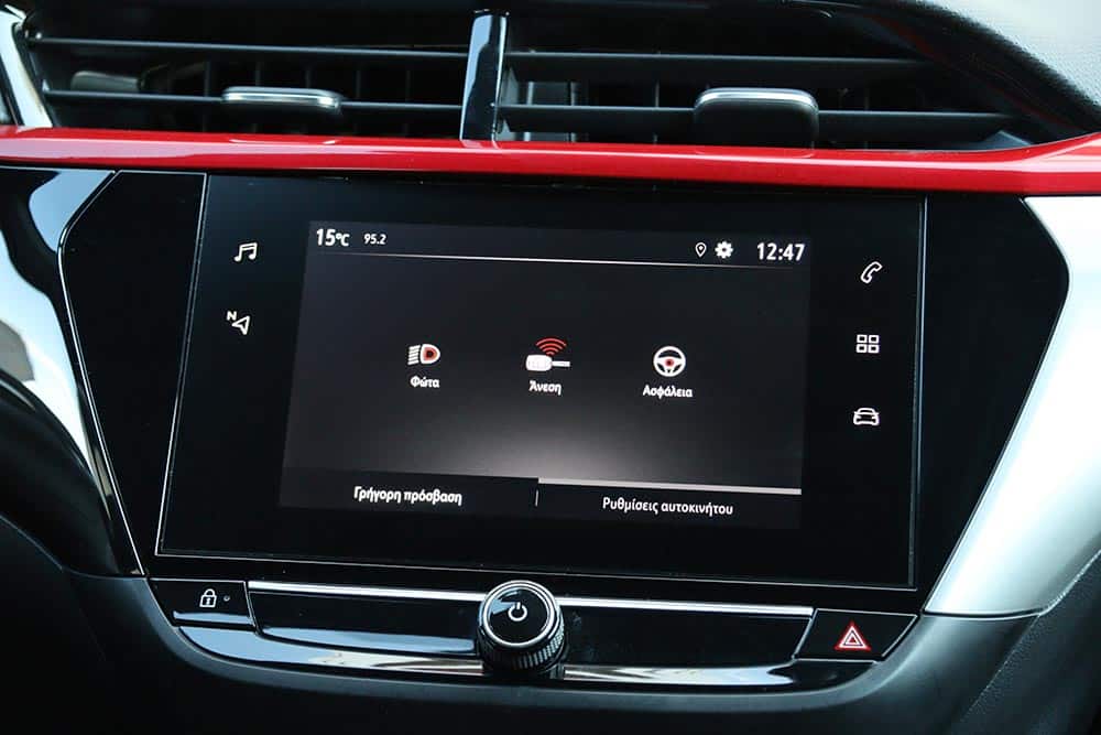 Στο εσωτερικό το Corsa δίνει έμφαση στη λειτουργικότητα και την εργονομία, αφήνοντας τις σχεδιαστικές εξάρσεις για το εκ Γαλλίας αδερφάκι του. Ο εξτρά λιτός ψηφιακός πίνακας οργάνων και η οθόνη αφής των 7 ιντσών (5 ιντσών στη βασική έκδοση) επικεντρώνονται στην ευκολία χρήσης , η οποία ενισχύεται από τα περιστροφικά χειριστήρια του κλιματισμού. Εδώ δεν χρειάζεται να μπεις σε 3 υπομενού για να αλλάξεις θερμοκρασία. Απλά, λιτά κι απέριττα, με μια παραδοσιακή κίνηση του χεριού.