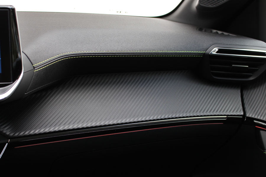 Μέσα η εικόνα δεν διαφοροποιείται έντονα από το 1.2 PureTech 100 (εδώ η δοκιμή του). Το τιμόνι είναι παχύ και διαθέτει πράσινες ραφές, μαζί με το σήμα «GT» στο κάτω μέρος, το ταμπλό φέρει ραφές ίδιου χρώματος, υπάρχει ένας ομολογουμένως εντυπωσιακός ambient φωτισμός, bucket καθίσματα και αλουμινένια πεντάλ.