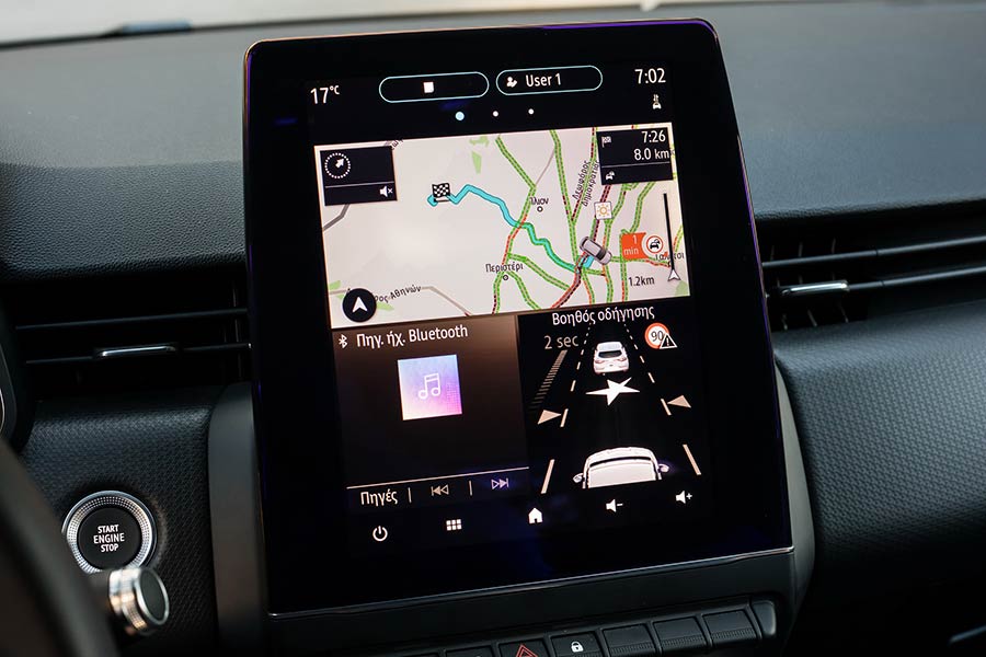 Στο εσωτερικό, αντίθετα, δεν υπάρχει η παραμικρή ομοιότητα σε σχέση με το Clio IV. Η οθόνη αφής των 7 ιντσών στο κέντρο του ταμπλό θυμίζει ξεκάθαρα Megane, το πιο σπορτίφ τιμόνι και ο ψηφιακός πίνακας οργάνων με μέγεθος από 7 έως 10 ίντσες (ανάλογα την έκδοση) βελτιώνουν κατακόρυφα το περιβάλλον μπροστά από τον οδηγό, ενώ το χορταστικό και μαλακό υλικό του ταμπλό παραπέμπει -κυριολεκτικά- σε αυτοκίνητο μεγαλύτερης κατηγορίας.