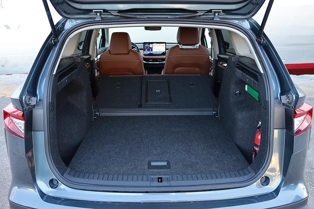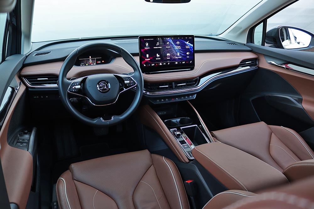 Περνώντας στο εσωτερικό, έρχεσαι αντιμέτωπος με μια ατμόσφαιρα που δεν απέχει από καθαρόαιμες προτάσεις των εδραιωμένων premium δυνάμεων. Δέρμα παντού, ποιοτικός διάκοσμος, οθόνη αφής 13 ιντσών να δεσπόζει στο κέντρο, ψηφιακό καντράν των μόλις 5,3 ιντσών (αρκετά λιτό είναι η αλήθεια) μπροστά από τον οδηγό και ambient φωτισμός δημιουργούν μια καμπίνα, που αν έλεγες πριν 10 χρόνια ότι θα άνηκε σε Skoda θα σε κοίταγαν με μισό μάτι. Μόνο το σκληρό και με άγρια υφή πλαστικό των εσωτερικών χειρολαβών δείχνει παράταιρο και θα μπορούσε να βελτιωθεί. Αυτό που ήταν και παραμένει ξεκάθαρα χαρακτηριστικό των Τσέχων, είναι οι χώροι. Ακόμα και 5 δίμετρους να καθίσεις στο Enyaq, δεν πρόκειται να ακούσεις το παραμικρό παράπονο. Μια από τα ίδια για το χώρο αποσκευών, που με 585 λίτρα συνιστά κορυφαία χωρητικότητα για ηλεκτρικό αυτοκίνητο.