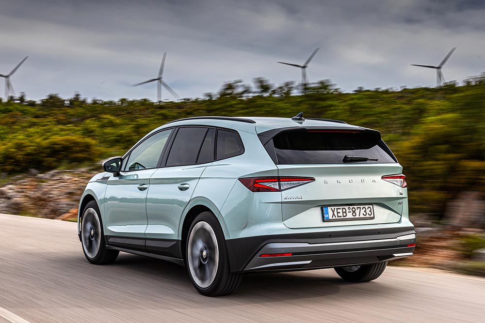Ακριβώς την αίσθηση που αποκομίζεις από το εσωτερικό, βιώνεις οδηγώντας το ηλεκτρικό Skoda. Παρά τις ζάντες των 21 ιντσών και το μπόλικο πέλμα των ελαστικών (235/50 μπροστά-255/45 πίσω), η ποιότητα κύλισης είναι εξαιρετική και τα επίπεδα εισερχόμενων θορύβου ελάχιστα. Κάτι που συνιστά ακόμα μεγαλύτερο κατόρθωμα για EV, καθώς λόγω της έλλειψης βαβούρας από κινητήρα και μετάδοση όλες οι λοιπές οχλήσεις (θόρυβος από αέρα και οδόστρωμα, συντονισμοί ανάρτησης) γίνονται ευκολότερα αντιληπτές από το αυτί.