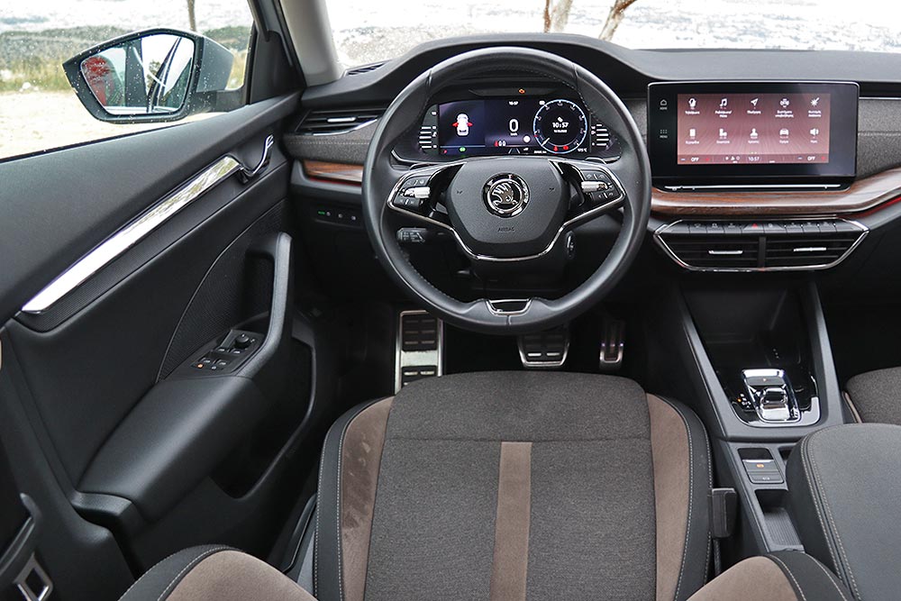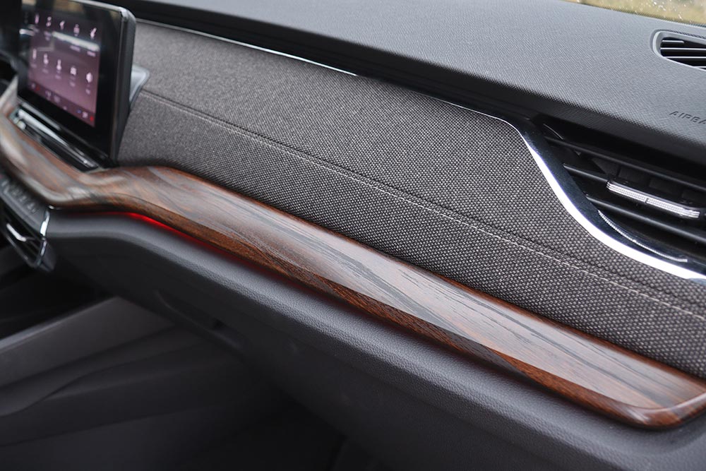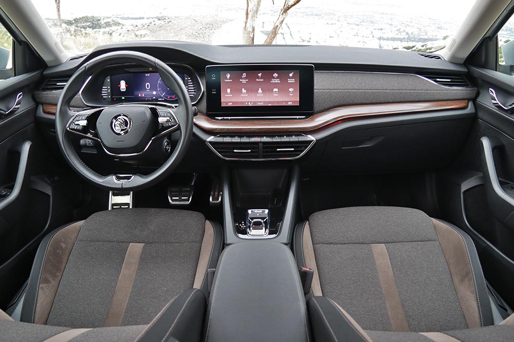 Καθίσματα και ταμπλό είναι ντυμένα σε υλικό Thermolux, που επιτρέπει 4,5 φορές περισσότερη διαπνοή και είναι εξαιρετική σε αφή, ταιριάζοντας ιδανικά στοιχεία πολυτέλειας και εκδρομικού προσανατολισμού. Η απομίμηση ξύλου στο ταμπλό αναβαθμίζει οπτικά το διάκοσμο, αλλά με το που την ακουμπήσεις καταλαβαίνεις πως πρόκειται για πλαστικό. Η συναρμογή στέκει σε υψηλό επίπεδο, όπως και η ποιότητα, αλλά η εργονομία έχει τα θεματάκια της – κυρίως λόγω του γεγονότος ότι οι περισσότερες λειτουργίες (ενεργοποίηση/απενεργοποίηση start-stop, για παράδειγμα), περνούν μέσα από την οθόνη αφής των 10 ιντσών και το σύστημα πολυμέσων.