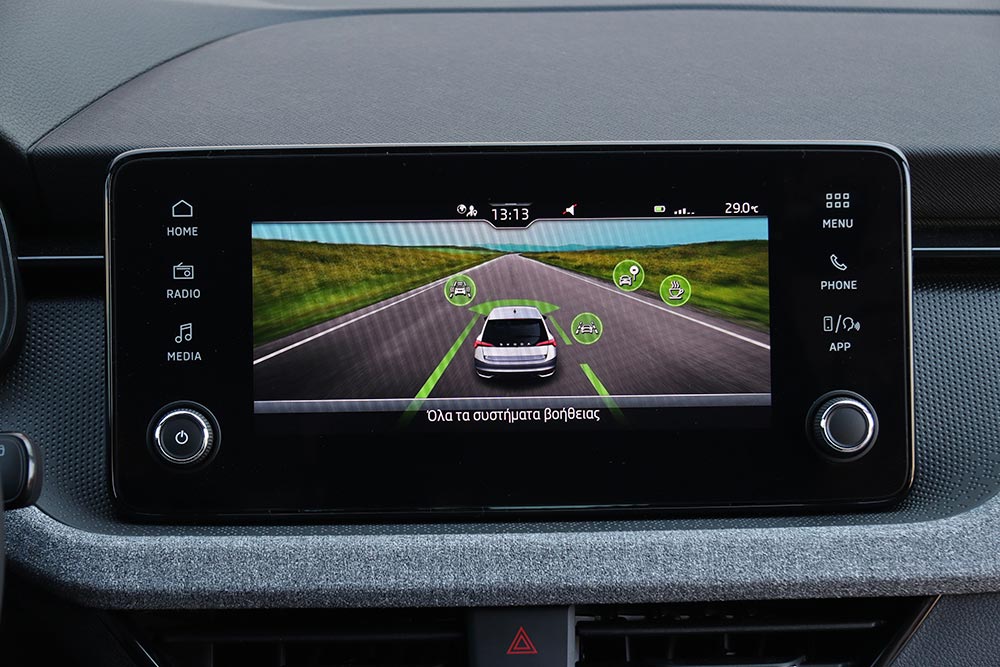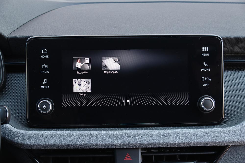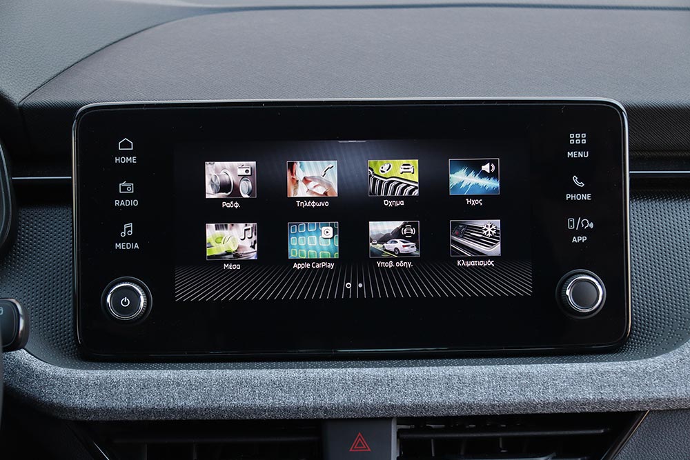 Η θέση οδήγησης είναι πολύ καλή, όπως και η πρακτικότητα μέσω των πολλών Simply Clever θηκών για μικροαντικείμενα και μπουκάλια. Εργονομικό μειονέκτημα αποτελεί η έλλειψη διακοπτών για τη ρύθμιση της κατεύθυνσης του αέρα του διζωνικού κλιματισμού, ο έλεγχος της οποίας γίνεται μέσω των επιλογών στο σχετικού μενού της οθόνης αφής. Στα σημαντικά πλεονεκτήματα του Scala παραμένουν οι κορυφαίοι του χώροι. Με μήκος 4.362 χλστ., πλάτος 1.793 χλστ., ύψος 1.514 χλστ. και μεταξόνιο 2.636 χλστ., το Scala εξυπηρετεί με άνεση τις μεταφορικές ανάγκες και των πιο ψηλών επιβατών στο πίσω κάθισμα, μιας και έχουν στη διάθεσή τους άφθονο αέρα για τα πόδια και το κεφάλι. Μεγάλο και πλήρως εκμεταλλεύσιμο είναι το πορτ μπαγκάζ των 467 λίτρων,φιλοξενώντας με άνεση όλες τις αποσκευές του ταξιδιού.