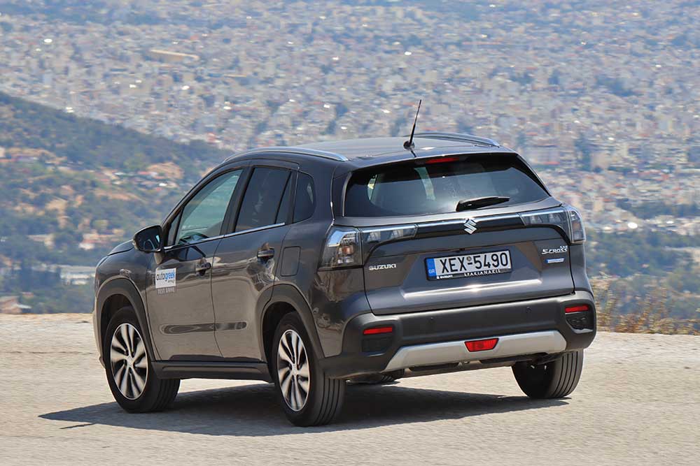 Η εμφάνιση του S-Cross 2ης γενιάς αποποιείται τα γονίδια υπερυψωμένου χάτσμπακ για χάρη καθαρών γραμμών SUV, που δίνουν στο αυτοκίνητο το πιο επιβλητικό παράστημα μέχρι σήμερα. Η επιτυχία των σχεδιαστών της Suzuki, όμως, δεν έγκειται μόνο στο καθαρά αισθητικό κομμάτι, αλλά και στο πρακτικό. Το αυτοκίνητο μπορεί να φαίνεται μισή κατηγορία πάνω σε μέγεθος, συγκριτικά με το απερχόμενο, όμως η εντύπωση αυτή δεν είναι παρά μια εκπληκτικά επιτυχημένη ψευδαίσθηση. Οι διαστάσεις παραμένουν ακριβώς, μα ακριβώς, στα ίδια επίπεδα: 4.300 χλστ. μήκος, 1.785 χλστ. πλάτος, 1.580 χλστ. ύψος, 2.600 χλστ. μεταξόνιο! Παρόλα αυτά, από όποια μεριά κι αν κοιτάξεις το σημερινό S-Cross σου φαίνεται πως έχει πάρει τουλάχιστον 10 πόντους προς κάθε κατεύθυνση.