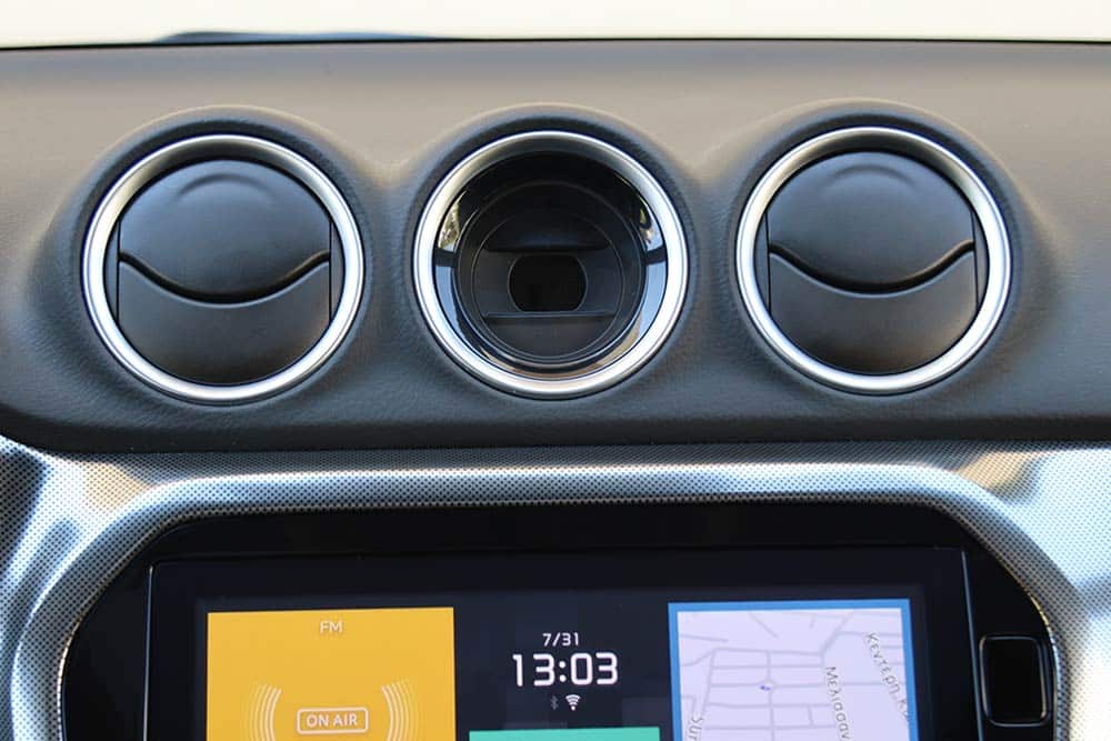 Ανοίγοντας την πόρτα και μπαίνοντας στην καμπίνα, το περιβάλλον είναι απόλυτα οικείο με τον προκάτοχο του. Το μάτι ωστόσο θα «πέσει» στη νέα στάνταρ κεντρική οθόνη των 9 ιντσών που αντικαθιστά την προηγούμενη των 7 ιντσών και είναι πλέον συμβατή με ασύρματη σύνδεση Apple Car Play και Android Auto. Η διαφορά δεν εστιάζεται μόνο στο μεγαλύτερο μέγεθος αλλά κυρίως στο πάνελ υψηλής ανάλυσης και στην πιο εργονομική διάταξη των μενού, ώστε να μην χάνεται ο οδηγός στην αναζήτηση των επιμέρους επιλογών όπως πριν. Σε αυτό συμβάλλουν και οι πολλοί φυσικοί διακόπτες που ευτυχώς η Suzuki επιμένει να διατηρεί. Μπορεί βέβαια η συνολική εικόνα της κονσόλας να φαίνεται κάπως ξεπερασμένη και παλιομοδίτικη, αλλά στην πράξη η επιλογή αυτή είναι άκρως πρακτική και αποτελεσματική στην καθημερινή χρήση. Τη θέση του κεντρικού αναλογικού ρολογιού ανάμεσα στους δύο αεραγωγούς έχει πάρει τώρα ένας αισθητήρας που παρακολουθεί τον οδηγό για σημάδια κόπωσης και τον ειδοποιεί με ηχητικό και οπτικό σήμα. Επιπλέον και ένεκα της GSR2 συμμόρφωσης, ακόμα και η βασική έκδοση GL εφοδιάζεται με τα συστήματα Suzuki Safety Support, το Dual Sensor Brake Support II (DSBS II), το προσαρμοζόμενο Cruise Control (Adaptive Cruise Control – ACC), την υποβοήθηση παραμονής στη λωρίδα, αναγνώριση σημάτων κυκλοφορίας κ.ά.