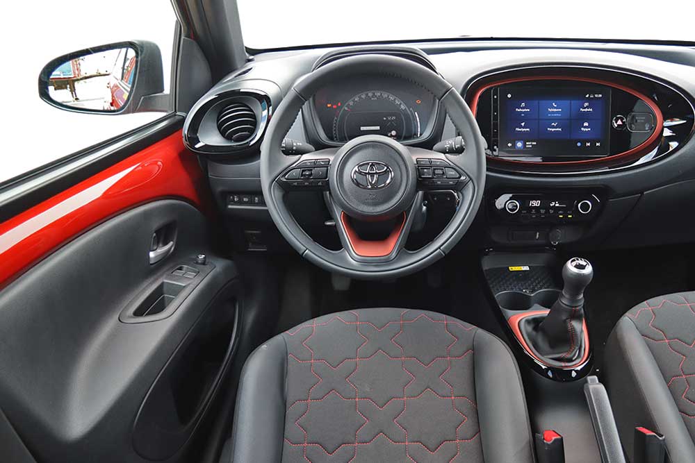 Τα υλικά στο γεμάτο καμπύλες ταμπλό είναι σκληρά μεν, αλλά η συναρμολόγηση είναι πολύ καλή με απουσία τριγμών και άλλων θορύβων. Και στην τρίτη γενιά του Aygo οι ακάλυπτες μεταλλικές επιφάνειες στις πόρτες έμειναν, κάτι που σε άλλους αρέσει, ενώ κάποιους τους ξενίζει, γιατί οι επενδύσεις δείχνουν φτωχές. Οι αυξημένες διαστάσεις του νέου Aygo X έχουν ευεργετικές επιπτώσεις και στους χώρους. Οι δύο εμπρός επιβάτες κάθονται άνετα, ενώ ισάριθμοι στο πίσω κάθισμα χωρούν πιο εύκολα, αλλά και πάλι οριακά ως προς τον αέρα για τα πόδια. Κύριο μειονέκτημα αποτελεί το μικρό άνοιγμα των πίσω θυρών, μαζί με τα παράθυρα που (πάλι) ανοίγουν μόνο προς τα έξω. Κερδισμένο είναι και το πορτ μπαγκάζ που μεγάλωσε κατά 60 λίτρα, φτάνοντας τα 231 λίτρα. Έτσι δεν φορτώνετε μόνο τα απαραίτητα ψώνια του σούπερ μάρκετ, αλλά μπορείτε να πάτε και μια μικρή εκδρομή.