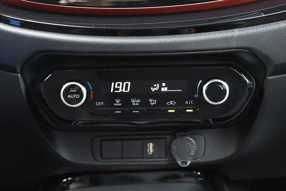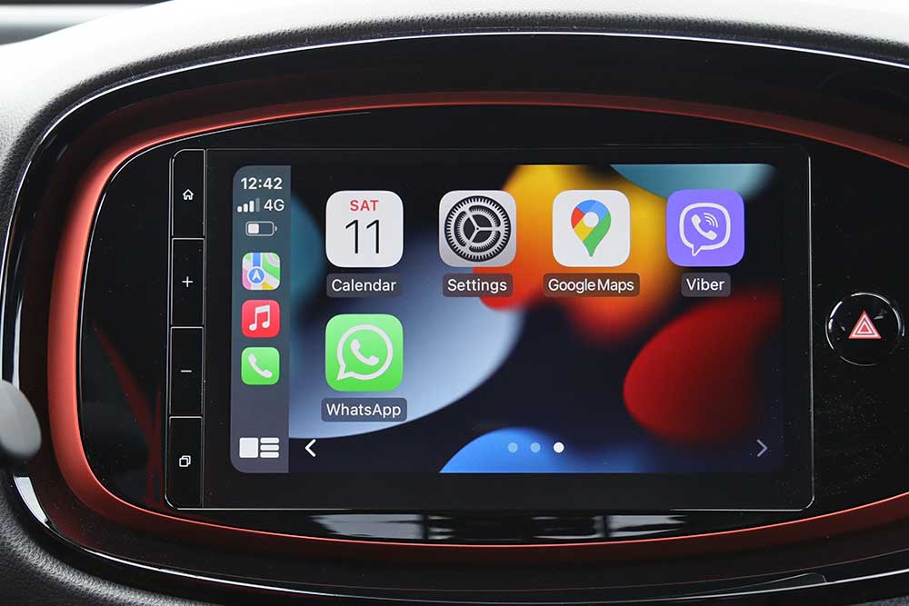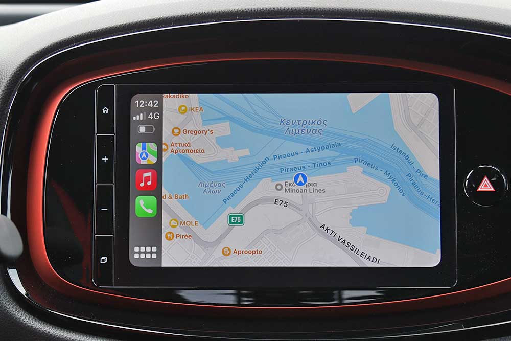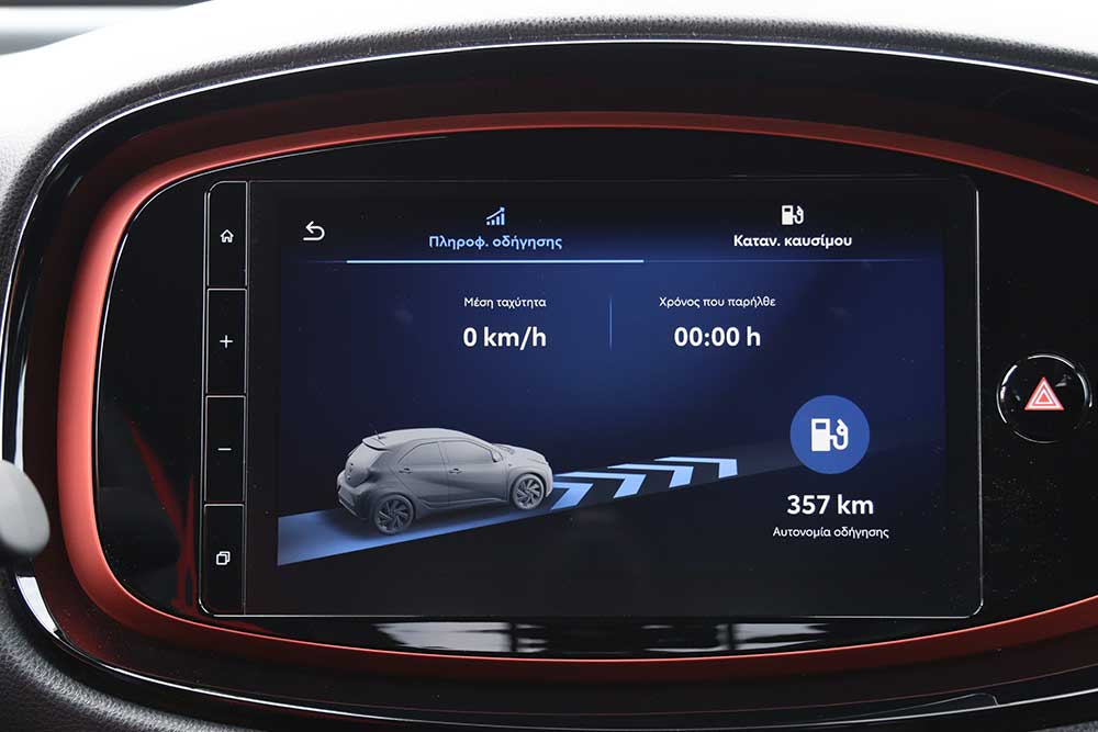 Μπαίνοντας μέσα την παράσταση «κλέβει» η κεντρική οθόνη οθόνη αφής των 9 ιντσών (στάνταρ 7 ιντσών), που ελέγχει το σύστημα πολυμέσων Toyota Smart Connect με το MyT smartphone app. Μπορεί να δεχτεί ενημερώσεις over the air και είναι συμβατή με τα πρωτόκολλα Apple CarPlay και Android Auto. Προσφέρει επίσης πλοήγηση βασισμένη σε cloud για πληροφορίες διαδρομής σε πραγματικό χρόνο μέσω των διαρκώς συνδεδεμένων υπηρεσιών. Το μενού είναι πολύ εύκολο στη χρήση, με ευκρινή και όμορφα γραφικά, ενώ απουσιάζει και η ενοχλητική υστέρηση στην εναλλαγή των περιεχομένων. Ειδικά το Apple CarPlay που δοκιμάσαμε εκτεταμένα, λειτούργησε υποδειγματικά, παρέχοντας όλες τις ευκολίες του κινητού τηλεφώνου με μια ματιά.