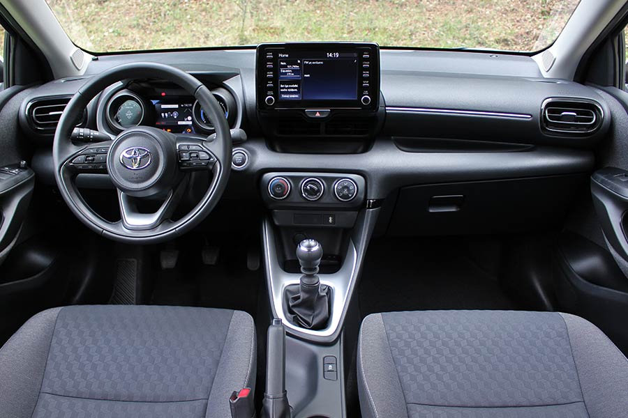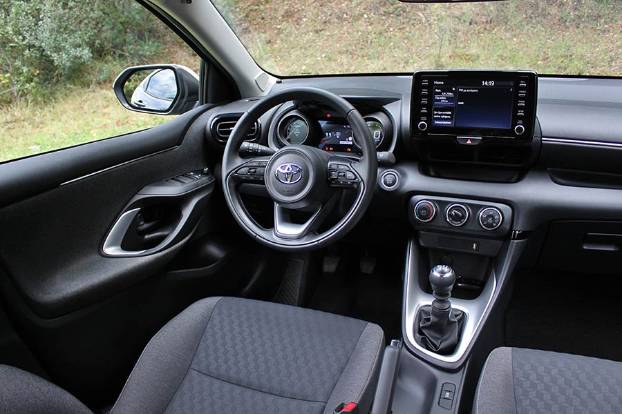 Στην καμπίνα των επιβατών, η σχεδιαστική απόσταση μεταξύ απερχόμενου και παρόντος Yaris είναι μικρότερη. Το ψηφιακό καντράν, με τα δυο κυκλικά όργανα (από την τρίτη έκδοση Style και άνω) και την οθόνη LCD ανάμεσά τους, και η κεντρική οθόνη αφής των 8 ιντσών (7 ιντσών στη βασική έκδοση) προσδίδουν νεανικότητα, αλλά και high tech αύρα. Το νέο τιμόνι παρουσιάζεται ασύγκριτα πιο σπορτίφ, με ένα μεγάλο μέρος του ταμπλό να απαρτίζεται από μαλακό πλαστικό. Ακόμα και εκεί που υπάρχει σκληρό, πάντως, δεν εντοπίζεται παράπονο για το συνδυασμό ποιότητας-συναρμογής.