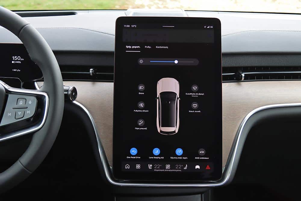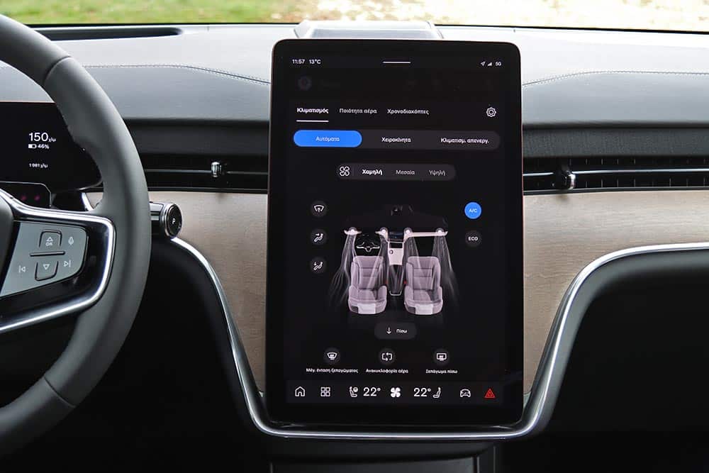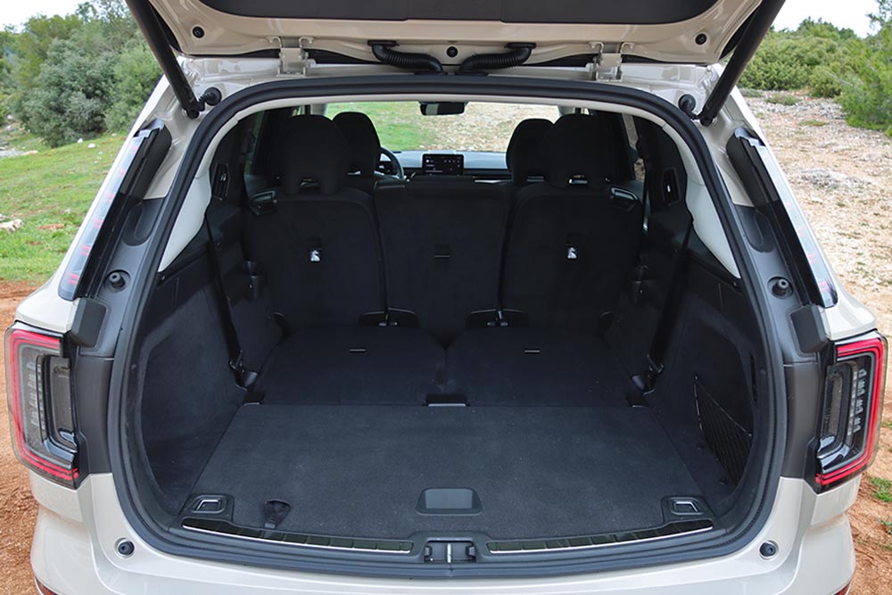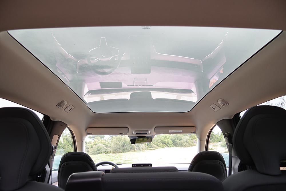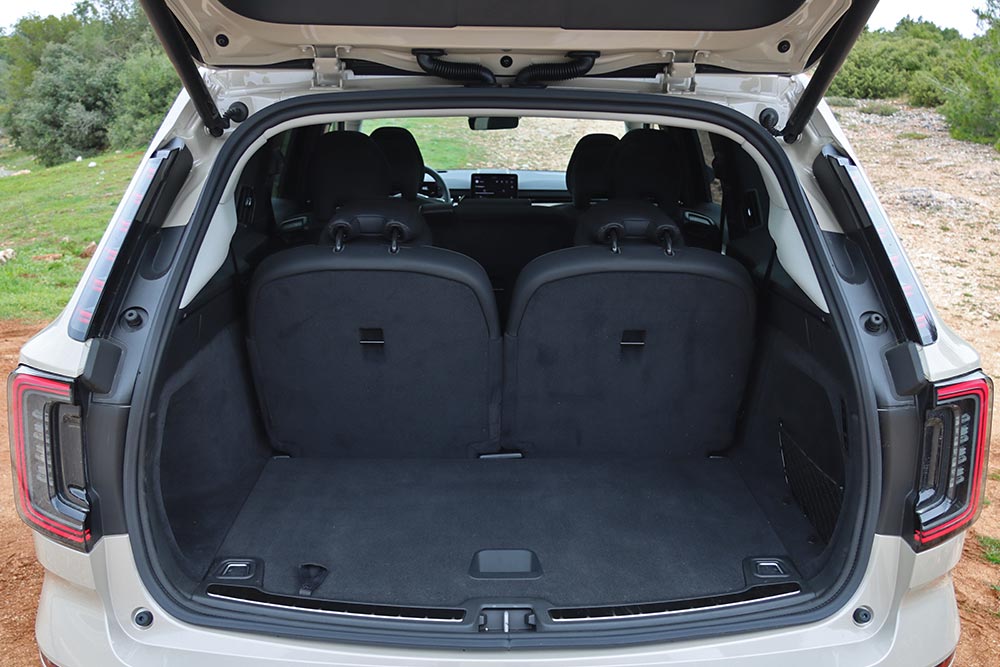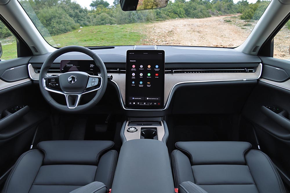 Ανοίγοντας τη βαριά πόρτα, σε καλωσορίζει μια τεκτονική καμπίνα που βρίθει τεχνολογικών εφαρμογών, αλλά και πολυτέλειας. Το συνθετικό δέρμα, φερ’ ειπείν, που είναι κατασκευασμένο από ανακυκλωμένα υλικά, καλύπτει πρακτικά τα πάντα. Η πανοραμική ηλιοροφή σχεδόν ολόκληρο τον «ουρανό». Γενικά, από ποιότητα κατασκευής και χώρους δεν γίνεται να έχεις παράπονο. Μέχρι 7 επιβάτες θα βολευτούν εύκολα (πανεύκολα οι 3 της μεσαίας σειράς), την ώρα που όλα τα καθίσματα διπλώνονται/αναδιπλώνονται με το πάτημα ενός κουμπιού, και ξεχωριστά το ένα από το άλλο. Κάπως έτσι βλέπεις το πορτμπαγκάζ να πηγαίνει από τα 372 στα 2.019 λίτρα, συν τα 49 λίτρα από το frunk και την τεράστια άπλα κάτω από την κεντρική κονσόλα, που μπορεί να χωρέσει μέχρι βαλιτσάκι (72 λίτρα χώροι για μικροαντικείμενα).