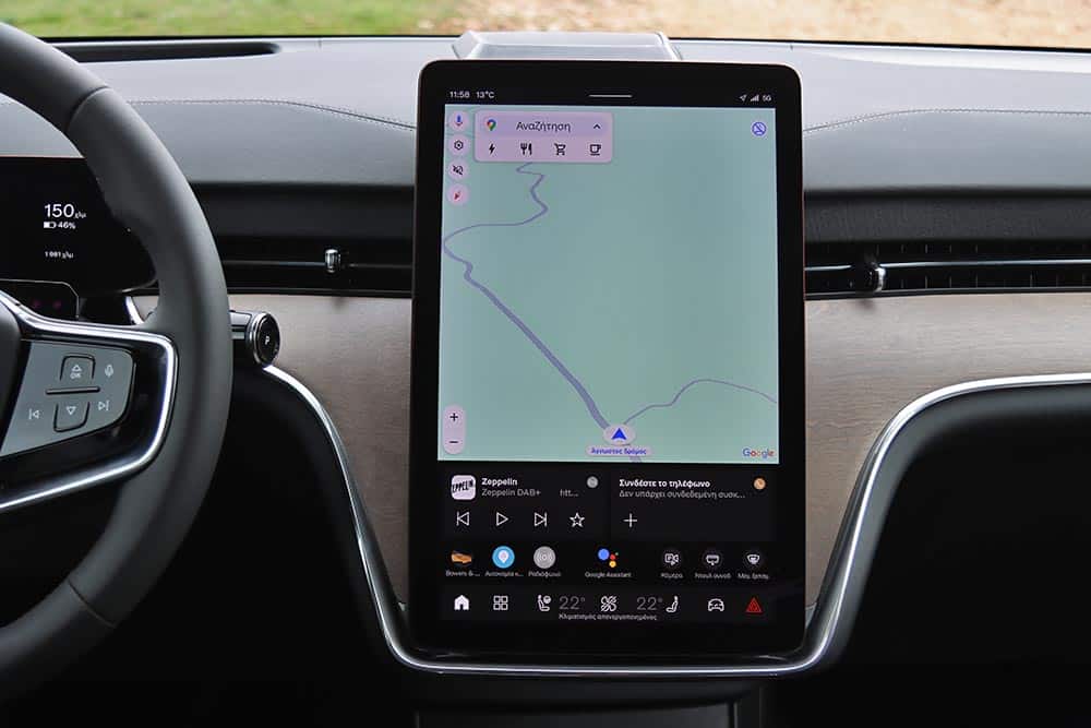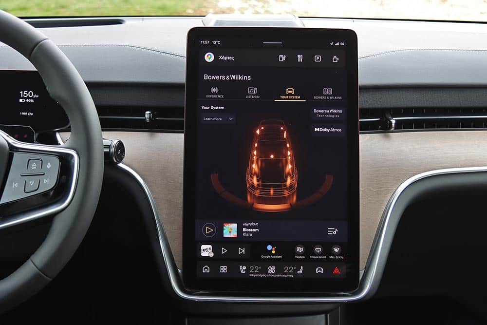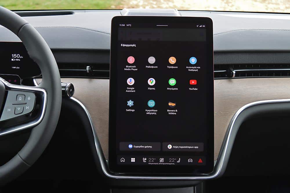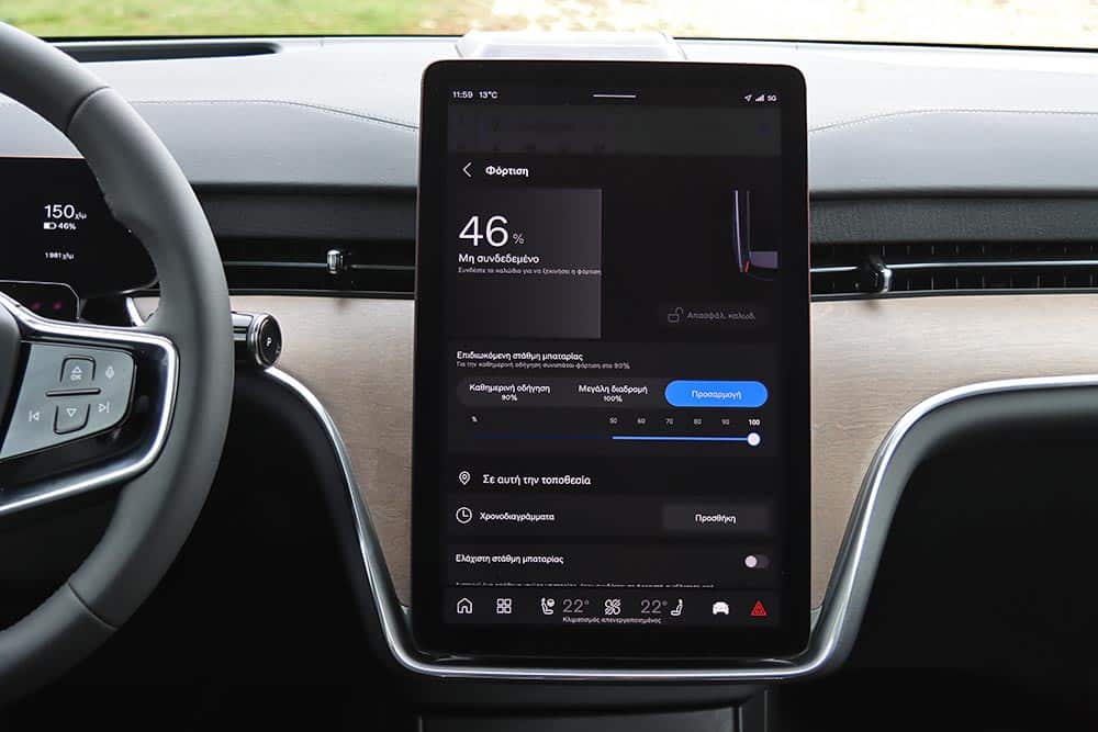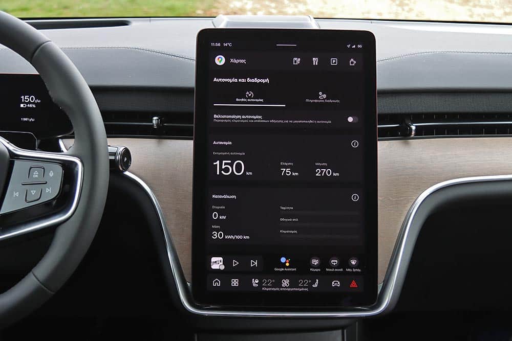 Μόλις 4,9 δλ. για το 0-100 χλμ./ώρα, ταχύτητες αυτοκινητοδρόμου (130-140 χλμ./ώρα) που επιτυγχάνονται και διατηρούνται κυριολεκτικά χαϊδεύοντας το δεξί πεντάλ, προσπεράσματα ισοδύναμα με διεκπεραιωτικές διαδικασίες, γενικότερα μια απίστευτη άνεση στις μετακινήσεις. Με τόση δύναμη διαθέσιμη και βάρος στους 2,7+ τόνους, αναμενόμενα η κατανάλωση κυμαίνεται ψηλά. Κάτω από 25 kWh/100 χλμ. πέφτεις μόνο στην πόλη, παρά τον πολύ καλό συντελεστή οπισθέλκουσας Cd 0,29, που βοηθά τα μάλα στην εθνική. Αν εκμεταλλευτείς την ισχύ του EX90 Twin Motor Performance φτάνεις να δεις και 40 kWh/100 χλμ., με τη μέση τιμή στη δοκιμή να διαμορφώνεται στις 28,2 kWh/100 χλμ. Κοντολογίς, τα 613 χλμ. που υπόσχονται τα εργοστασιακά νούμερα δεν τα βλέπεις (ούτε τα 760 χλμ. σε αστικό κύκλο). Ωστόσο, η συστοιχία των 111 kWh (ωφέλιμες οι 107 kWh) φροντίζει να ισοσταθμίσει τις αυξημένες απαιτήσεις ενέργειας, εξασφαλίζοντας μια ρεαλιστική αυτονομία γύρω στα 520-550 χλμ. Η πλήρης φόρτιση της μπαταρίας μπορεί να ολοκληρωθεί εντός 11 ωρών σε Wallbox, ενώ σε ταχυφορτιστή 250 kW το 10%- 80% απαιτεί λιγότερο από μισή ώρα.