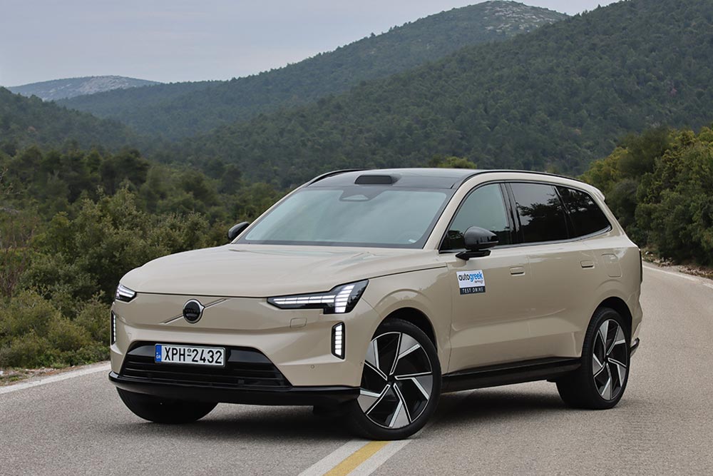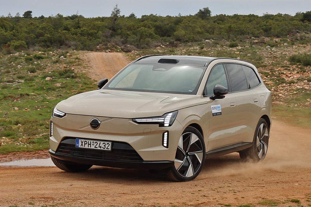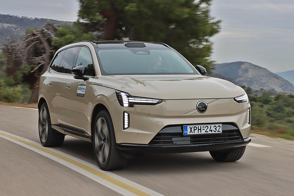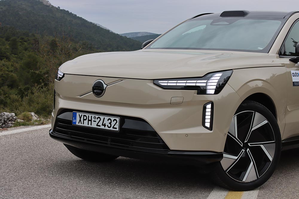 Παρά τη διάσταση των τροχών, η απορρόφηση των κραδασμών κυμαίνεται σε κορυφαία πλαίσια. Κάποιες ξερές αντιδράσεις δεν λείπουν, όμως δεν αρκούν για να χαλάσουν τη συνολική εικόνα άνεσης και γαλήνης, στην αγχολυτική εμπειρία που ονομάζεται «οδήγηση EX90». Η ησυχία στο ταξίδι είναι παροιμιώδης, ενώ εξίσου εντυπωσιακή κρίνεται η συμπεριφορά του θηριώδους SUV στο στροφιλίκι. Εκπληκτικά μικρές κλίσεις, ατελείωτη πρόσφυση, τρομερά φρένα (400 χλστ. δίσκοι εμπρός, 390 χλστ. πίσω) που υποβοηθούνται από την ανάκτηση ενέργειας, και μια αποτελεσματικότητα στο στρίβειν που μόνο SUV 5+ μέτρων και 2,7+ τόνων δεν θυμίζει. Δεν νιώθεις συμμέτοχος βέβαια, καθώς η αίσθηση από τα χειριστήρια σε κρατά απόμακρο, εντούτοις αν αποφασίσεις να πας πολύ γρήγορα στο βουνό, το μεγάλο Volvo δεν θα σου το αρνηθεί.