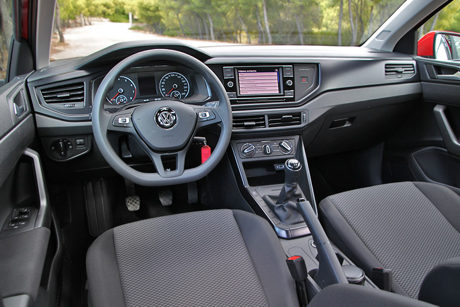 Το εσωτερικό του βασικού Polo δε διαφέρει σχεδιαστικά από εκείνο των υπολοίπων εκδόσεων και διαθέτει σύγχρονη εμφάνιση με έμφαση στην πρακτικότητα. Το μαλακό πλαστικό που συναντάμε τις ακριβότερες εκδόσεις, απουσιάζει και συναντώνται σκληρά πλαστικά με πολύ καλή υφή και άρτια συναρμογή. Στα θετικά στοιχεία του εσωτερικού ανήκουν ακόμα η εργονομία των διαφόρων χειριστηρίων και η πολύ καλή θέση οδήγησης. Ξεχωρίζουν επίσης η μαλακή αίσθηση των πεντάλ και ο εύχρηστος επιλογέας των ταχυτήτων, που το καθιστούν ιδιαίτερα ευχάριστο στις αστικές μετακινήσεις.