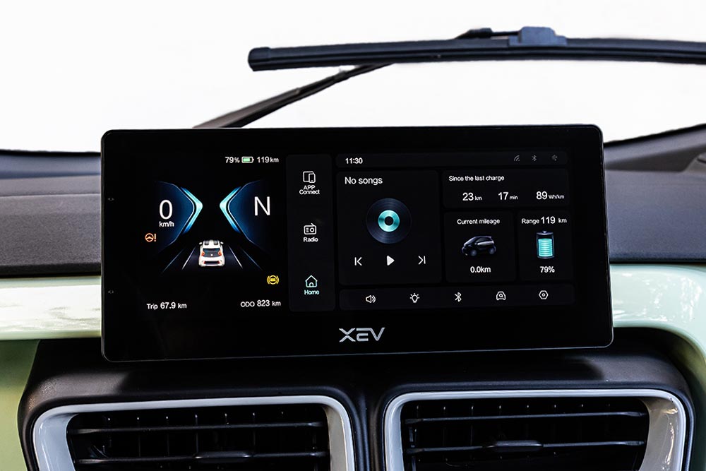 Ο όμορφος ιταλικός σχεδιασμός περνάει και στο εσωτερικό του κινεζικού μοντέλου, με σαφώς ευρωπαϊκής κουλτούρας, σχεδιαστική αρχιτεκτονική. Όλα είναι κατασκευασμένα από σκληρό πλαστικό με τη συναρμογή να κρίνεται ικανοποιητική για τα δεδομένα της κατηγορίας. Τα καθίσματα είναι υφασμάτινα, έχουν ωραία υφή και σχεδιασμό, ρυθμίζονται και ως προς την κλίση της πλάτης, παρέχουν υποτυπώδη πλευρική στήριξη, αλλά κυρίως, είναι ξεκούραστα στις πολλές ώρες οδήγησης. Αν ο οδηγός είναι ψηλός (όπως ο υποφαινόμενος), θα δυσκολευτεί να βρει βολική θέση οδήγησης καθώς το τιμόνι δεν ρυθμίζεται σε καμία κατεύθυνση. Παρόλη τη minimal «γυμνή» εμφάνιση, εξακολουθεί να διαθέτει τα απαραίτητα, όπως «τεμπέλη», αρκετές θήκες για μικροαντικείμενα, τρεις θύρες USB και πρίζα 12V. Δεν υπάρχει ντουλαπάκι, αλλά ένα διχτάκι (και στις πόρτες) για λίγα έγγραφα. Μιλώντας για εξοπλισμό, αυτός είναι κάθε άλλο από φτωχός, όποια έκδοση και να διαλέξεις. Ειδικά στη Joy και Sprint, συναντάμε μια κεντρική οθόνη αφής 10,2 ιντσών με λειτουργία ραδιοφώνου και Mirror Screen (Car Play) με όλες τις απαραίτητες ενδείξεις όπως ταχύμετρο, ποσοστό μπαταρίας, υπολειπόμενα χλμ., κτλ. Για τις Entry και Easy, η οθόνη/πίνακας οργάνων είναι 7 ιντσών με βάση τοποθέτησης smartphone.
