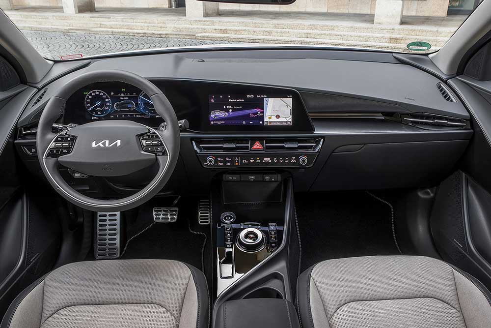 Στο θάλαμο των επιβατών του νέου Niro κυριαρχούν τρία βασικά στοιχεία: Οι ευθείες γραμμές, οι επίπεδες επιφάνειες και το ενιαίο πάνελ στο ταμπλό, όπου ενσωματώνονται οι δύο στάνταρ οθόνες. Η μία αφορά τον ψηφιακό πίνακα οργάνων των 10,25 ιντσών και η άλλη τη οθόνη αφής του infotainment με επίσης 10,25 ίντσες. Πολύ εξυπηρετικό είναι και το Head-Up Display με την οθόνη των 10 ιντσών, όπου στο παρμπρίζ εμφανίζονται πολλές πληροφορίες, όπως για την οδήγηση, την πλοήγηση και τα συστήματα ADAS. Στην κεντρική κονσόλα συναντάται το διαισθητικό χειριστήριο δύο λειτουργιών, που έχουμε δει στο EV6 και στο νέο Sportage. Ανάμεσα από τα εμπρός καθίσματα βρίσκεται το γνωστό επίσης πάνελ που ενσωματώνει και το περιστροφικό χειριστήριο για την επιλογή της μετάδοσης (R, N, D), δεδομένου ότι δεν υπάρχει Niro με χειροκίνητο κιβώτιο ταχυτήτων.