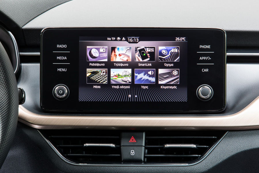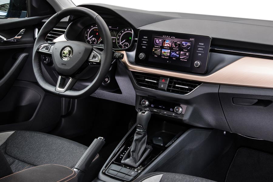 Εντελώς νέα είναι και η εικόνα που αντιλαμβάνεται άμεσα κανείς από στο εσωτερικό του Skoda Scala. Υπεύθυνος σχεδιασμού είναι ο Έλληνας σχεδιαστής της Skoda, o κ. Δημήτρης Δαρκούδης, τον οποίο είχαμε τη χαρά και την τιμή να γνωρίσουμε στην παρουσίαση του αυτοκινήτου στην Αθήνα και μας ανέλυσε κάθε λεπτομέρεια για αυτό. Το χαρακτηριστικό σχήμα του φτερού που σχηματίζεται στο άνω τμήμα της μάσκας, συναντάται και στο ταμπλό, ενώ στην εσοχή έχει τοποθετηθεί η οθόνη αφής του συστήματος πολυμέσων, διαστάσεων 6,5 ιντσών στην αρχική έκδοση και 8 ιντσών στις πιο πλούσιες. Προαιρετικά διατίθεται η οθόνη των 9,2 ιντσών, καθώς και ο ψηφιακός πίνακας οργάνων των 10,25 ιντσών.
