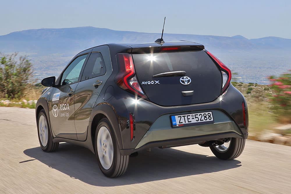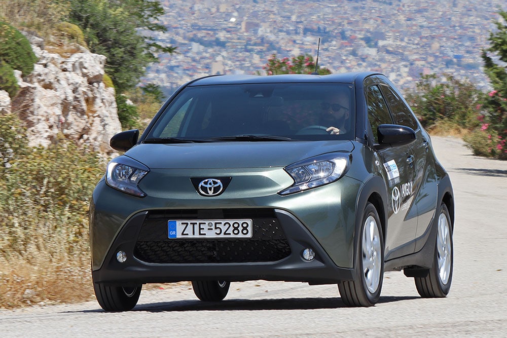 Πολύ καλή και η ηχομόνωση, που φροντίζει να κρατάει εκτός τα περισσότερα ντεσιμπέλ από μοτέρ και αέρα. Στην εθνική μπορείς εύκολα να κινείσαι με 130 χλμ./ώρα, απολαμβάνοντας παράλληλα αξιοσημείωτη σταθερότητα. Οι 17άρηδες τροχοί, τα φαρδύτερα μετατρόχια και το ολοκαίνουργιο πάτωμα εξαργυρώνουν τις «μάρκες» τους στο δρόμο, δίνοντας περισσότερη αίσθηση -σωστά μαντεύετε- Yaris στο Aygo από κάθε άλλη φορά. Το αυτό πηγαίνει και για το -όσο πρέπει- βαρύ τιμόνι υπό γωνία, όπου το X στρίβει δίχως υστέρηση, με σεβαστή ακρίβεια και απρόσμενα λίγες κλίσεις. Μάλιστα η ουρά θέλει να συμμετέχει στις διαδικασίες περιστροφής, κάνει να γυρίσει -κατόπιν παραίνεσης από τον οδηγό- αλλά τελικά δεν αποδρά από τα δεσμά του ESP.