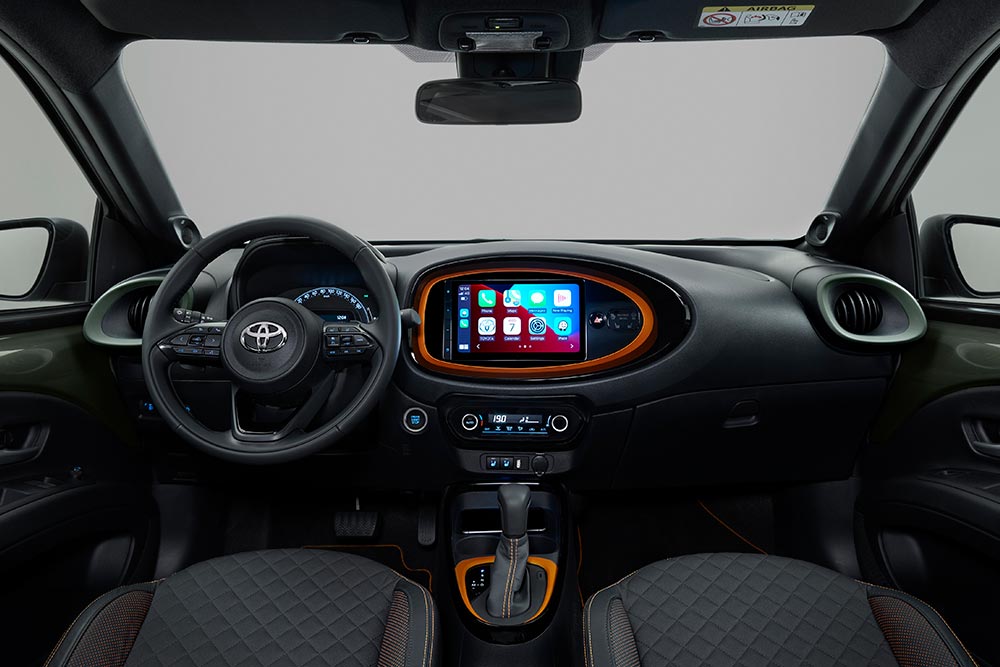 Πρωταγωνιστής του καμπυλωτού και σκληρού, αλλά καλοσυναρμολογημένου, ταμπλό είναι αναμφίβολα η οθόνη αφής των 9 ιντσών, που ελέγχει το σύστημα πολυμέσων Toyota Smart Connect. Ευκρινής και πανεύκολη στη χρήση, με σωστά γραφικά και ανετότατη περιήγηση στο μενού, δείχνει τον ψηφιοποιημένου χαρακτήρα του Aygo X. Το ίδιο ισχύει για τη δυνατότητα over-the-air αναβαθμίσεων και την παρουσία των Apple CarPlay – Android Auto, ενώ μοναδικό προσόν συνιστά η «ομπρέλα» ασφαλείας Toyota Safety Sense και Advanced Driver Assistance, που είναι στάνταρ.