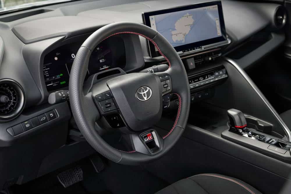 Για την κατασκευή του εσωτερικού, η Toyota έχει κάνει χρήση μαλακών υλικών σε διάφορες επιφάνειες του ταμπλό και των πάνελ των θυρών. Σε επίπεδο χώρων το νέο C-HR βρίσκεται σε μέτρια επίπεδα για τα δεδομένα των C-SUV, όπως άλλωστε συνέβαινε και με τον προκάτοχό του. Στο πίσω κάθισμα ο αέρας για τα πόδια και το κεφάλι επαρκεί για άτομα με ύψος γύρω στα 1,75 μέτρα, όμως οι πιο ψηλοί θα στριμωχτούν. Το ίδιο ισχύει και για το συνοδηγό, όπου το διαθέσιμο πλάτος στα πόδια περιορίζεται από την κεντρική κονσόλα. Μικρός είναι και ο χώρος αποσκευών των 388 λίτρων (+11 λτ. από το προγενέστερο C-HR) ή 362 λτ. στο AWD-i, που είναι πιο λίγος και από πολλών B-SUV (397 λτ. το Yaris Cross). Άλλωστε όσοι θέλουν περισσότερους χώρους και λιγότερο σπορ σχεδιασμό, υπάρχει η εναλλακτική πρόταση από την Toyota, το πιο πρακτικό Corolla Cross.