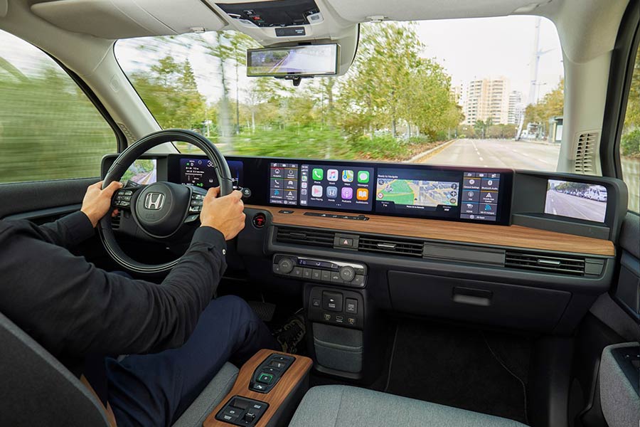 Πολύ εντυπωσιακό με ρετρό πινελιές και hi-tech τεχνολογία είναι το εσωτερικό του. Κυρίαρχο στοιχείο αποτελούν οι οθόνες που εκτείνονται σε όλο το πλάτος του ταμπλό και θυμίζουν αυτοκίνητο από ταινία επιστημονικής φαντασίας, με τη διαφορά ότι είναι εντελώς πραγματικό. Στις άκρες βρίσκονται οι οθόνες των 6 ιντσών, όπου προβάλλεται καθαρή εικόνα από τις εξωτερικές κάμερες. Ο οδηγός το συνηθίζει γρήγορα, ενώ υπάρχουν ρυθμίσεις προς όλες τις κατευθύνσεις. Πίσω από το τιμόνι υπάρχει ο ψηφιακός πίνακας οργάνων των 8,8 ιντσών και δεξιά δύο ακόμα οθόνες 12,3 ιντσών η κάθε μία, με τις ίδιες ακριβώς δυνατότητες. Ακόμα μια καινοτομία του Honda e είναι η τεχνητή νοημοσύνη που ενσωματώνεται στο ηλεκτρικό μικρό μοντέλο, μέσω της υπηρεσίας Honda Personal Assistant που χρησιμοποιεί μοναδική κατανόηση των συμφραζομένων, ώστε να δημιουργεί φυσικό διάλογο και να παρέχει πρόσβαση σε μια σειρά από online υπηρεσίες.