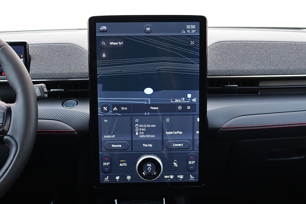 Στην καμπίνα η κάθετη οθόνη των 15,5 ιντσών με το σύστημα SYNC 4 κυριαρχεί στην κεντρική κονσόλα και προσφέρει πλήρη συνδεσιμότητα, αναβαθμίσεις over-the-air, καθώς και έξυπνη διαχείριση πλοήγησης, κλιματισμού και συστημάτων υποβοήθησης. Ο πίνακας οργάνων πίσω από το τιμόνι είναι επίσης πλήρως ψηφιακός, αλλά παραμένει απλός και λειτουργικός, παρέχοντας μόνο τις απαραίτητες πληροφορίες για τον οδηγό. Το προαιρετικό ηχοσύστημα της Bang & Olufsen φροντίζει για την ηχητική απόλαυση των επιβατών, όντας ένα εκ των καλύτερων που έχουμε δοκιμάσει, ενώ η -επίσης προαιρετική- γυάλινη πανοραμική οροφή ναι μεν αναβαθμίζει το ευήλιον της καμπίνας και την εξωτερική εμφάνιση, χωρίς να κοστίζει ιδιαίτερα μάλιστα (1.240 ευρώ), ωστόσο δεν συνίσταται για ελληνικά καλοκαίρια, καθώς δεν διαθέτει κάλυμμα. Κατά τα λοιπά, οι χώροι βρίσκονται σε πολύ καλό επίπεδο για 5 επιβάτες κάθε σωματότυπου, απολαμβάνοντας αρκετό αέρα για τα πόδια τους. Παραπονεμένες δεν μένουν ούτε οι αποσκευές, καθώς έχουν στη διάθεσή τους συνολικά 502 λίτρα (402 το κανονικό πορτμπαγκάζ και 100 το μπροστινό «Frunk», που εμπνέεται από το Megabox του Puma) και αρκετά εκμεταλλεύσιμο σχήμα.