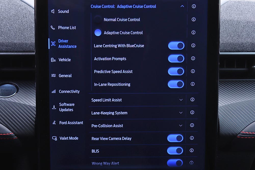Κάτι που σημαίνει ότι δεν μπαίνεις μέσα, ενεργοποιείς τα ηλεκτρονικά και σε πηγαίνει το αυτοκίνητο. Η τεχνολογία της Ford σε ξεκουράζει στα πολύωρα ταξίδια, δίνοντάς σου τη δυνατότητα να πάρεις χέρια-πόδια από τα χειριστήρια, όμως ζητάει διαρκώς εγρήγορση από εσένα και το βλέμμα σου στο δρόμο. Αν αρχίσεις να κοιτάς το τηλέφωνο ή να παίζεις με το infotainment, για παράδειγμα, θα δεχτείς ένα μπαράζ ηχητικών και οπτικών ειδοποιήσεων για τοποθέτηση χεριών στο τιμόνι. Εφόσον πας με τις ρυθμίσεις του, όμως, μπορείς να αφήσεις το -μερικό, το υπογραμμίζουμε- έλεγχο στα ηλεκτρονικά για ένα μεγάλο μέρος του εθνικού δικτύου στην Ελλάδα. Το BlueCruise χρησιμοποιεί ένα συνδυασμό από ραντάρ, αισθητήρες και κάμερες, προκειμένου να κρατά το αυτοκίνητο στο κέντρο της λωρίδας του και να διατηρεί σταθερή απόσταση από το προπορευόμενο όχημα (κυρίως το ενεργό cruise control και τη διατήρηση λωρίδας, δηλαδή), επιταχύνοντας, φρενάροντας και στρίβοντας κατά μόνας όπου χρειάζεται.
