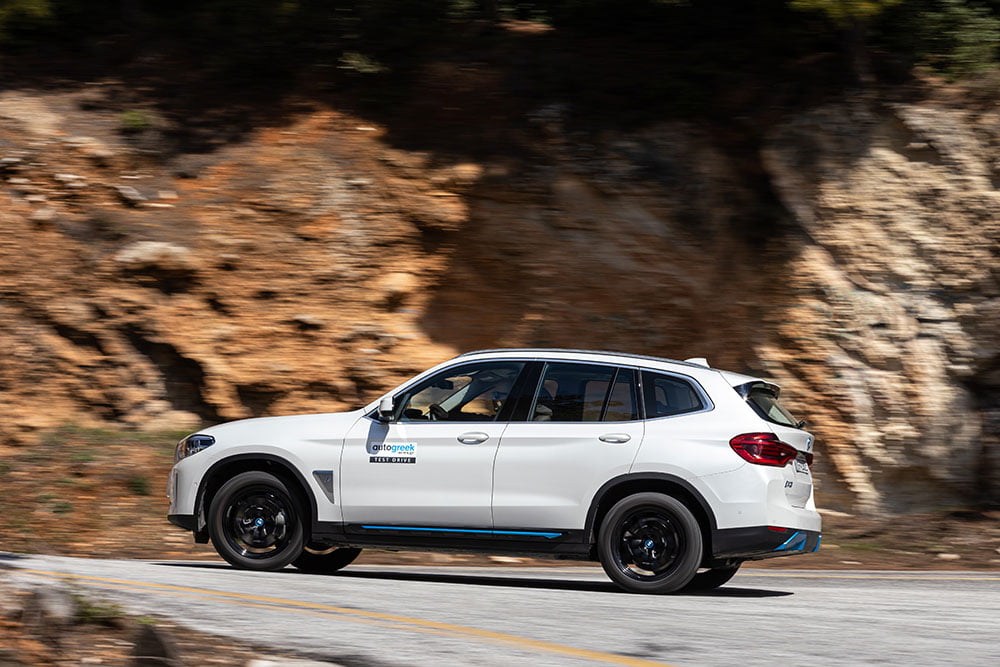 Η ποιότητα κύλισης είναι εξαιρετική κάτι που βοηθάει και το standard σύστημα της ηλεκτρονικά προσαρμοζόμενης απόσβεσης των αμορτισέρ. Στοιχείο που συνδυαστικά με την πολύ καλή ηχομόνωση, προσφέρουν ξεκούραστα κι άνετα ταξίδια στον αυτοκινητόδρομο. Η πολύ καλή οδική συμπεριφορά βέβαια της iX3 συνεχίζεται και στο ορεινό δίκτυο. Οι κλίσεις στις στροφές είναι λογικές για το χαρακτήρα του αυτοκινήτου, με το χαμηλό κέντρο βάρους (ένεκα της τοποθέτησης των μπαταριών χαμηλά στο δάπεδο) να προσφέρει ευελιξία ακόμα και σε πολύ κλειστές στροφές. Η αμεσότητα του ηλεκτροκινητήρα θα κάνει τους λάτρεις της σπορ οδήγησης να παρασυρθούν και να πιέζουν από στροφή σε στροφή. Με αντίκτυπο βέβαια στην κατανάλωση. Η επιλογή «όλα πίσω» είναι απολαυστική, ενώ αν απενεργοποιήσετε πλήρως το σύστημα ελέγχους της πρόσφυσης, η iX3 δεν θα σας αρνηθεί να κινηθεί υπό γωνία. Αλλά τότε είναι που θα ζητήσετε λίγο περισσότερο βάρος από το γρήγορο και με καλή πληροφόρηση τιμόνι.