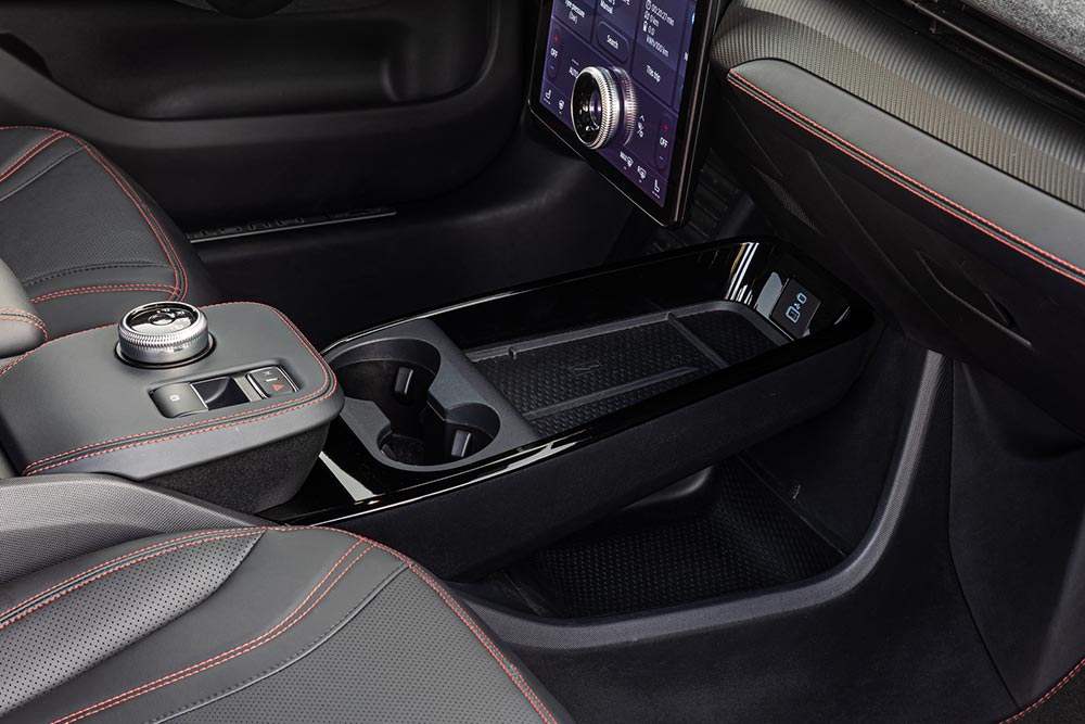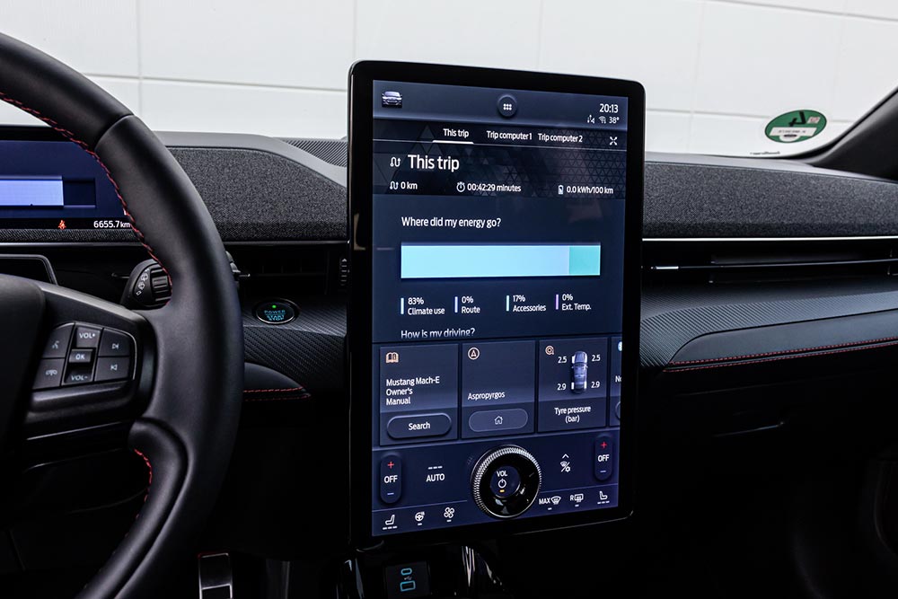 Από την πρώτη επαφή με τη Mustang Mach-E αντιλαμβάνεσαι ότι αυτό το αυτοκίνητο φέρει αρκετή τεχνολογία πάνω του. Αρχικά θα εντυπωσιαστείτε από τον τρόπο που θα σας επιτραπεί η είσοδος στο μυώδες ηλεκτρικό SUV, μέσω ενός κουμπιού στην μεσαία κολώνα. Όταν μπείτε στην καμπίνα θα σας ενθουσιάσει η νέα αρχιτεκτονική του ταμπλό, η οποία συμβάλλει στη δημιουργία ενός ευρύχωρου, μοντέρνου και high-tech εσωτερικού. Στο κέντρο του ταμπλό ξεχωρίζει η κάθετα τοποθετημένη οθόνη με διαγώνιο 15,5 ιντσών μέσω της οποίας ελέγχεται το προηγμένο σύστημα πολυμέσων SYNC4, αλλά και το σύστημα του κλιματισμού. Ο οδηγός λαμβάνει την απαραίτητη πληροφόρηση από τον ψηφιακό πίνακα οργάνων με διάσταση 10,2 ιντσών. Κατασκευαστικά, δεν θα έχετε το παραμικρό παράπονο, αφού τα υλικά που έχουν επιλεγεί είναι εξαιρετικά ποιοτικά και πολύ σωστά ταιριασμένα μεταξύ τους. Όσο προσεκτικά κι αν ψηλαφήσετε το ταμπλό δεν πρόκειται να βρείτε κάποια ατέλεια!