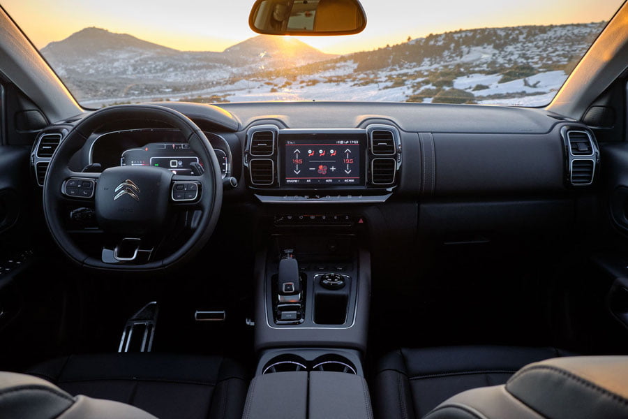 Η ευρυχωρία, η πρακτικότητα και η κομψότητα, είναι τα βασικά στοιχεία που αντιλαμβάνεται άμεσα αυτός που θα εισέλθει στο εσωτερικό του C5 Aircross. Ο οδηγός κάθεται ψηλά και απολαμβάνει πολύ καλή περιμετρική ορατότητα χάρη στις πολλές γυάλινες επιφάνειες περιμετρικά του αμαξώματος, ενώ εκτιμά αμέσως το αναπαυτικό και φαρδύ κάθισμα. Το οριζόντιας διάταξης ταμπλό εντείνει την αίσθηση ευρυχωρίας και πλαισιώνεται από απαλές καμπύλες και γεωμετρικούς αεραγωγούς. Στο κέντρο κυριαρχεί η μεγάλη οθόνη αφής των 8 ιντσών του συστήματος πολυμέσων, ενώ την υψηλή τεχνολογία υπογραμμίζει και ο πίνακας οργάνων με την προσαρμόσιμη ψηφιακή οθόνη TFT 12,3 ιντσών με τρία διαφορετικά στυλ γραφικών. Ποιοτικά έχει γίνει χρήση λεπτού μαλακού υλικού στην μπροστινή επιφάνεια του ταμπλό, όχι όμως και στο πάνω μέρος του, το οποίο αποτελείται από σκληρό πλαστικό. Ως σύνολο είναι προσεγμένο και αναβαθμίζεται από τον ιμάντα στο ταμπλό από την πλευρά του συνοδηγού, την ευρεία επιλογή επενδύσεων στα καθίσματα και τις 5 διαφορετικές εσωτερικές αποχρώσεις.