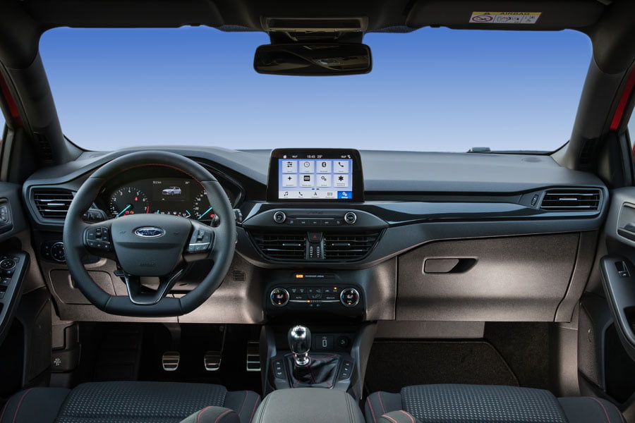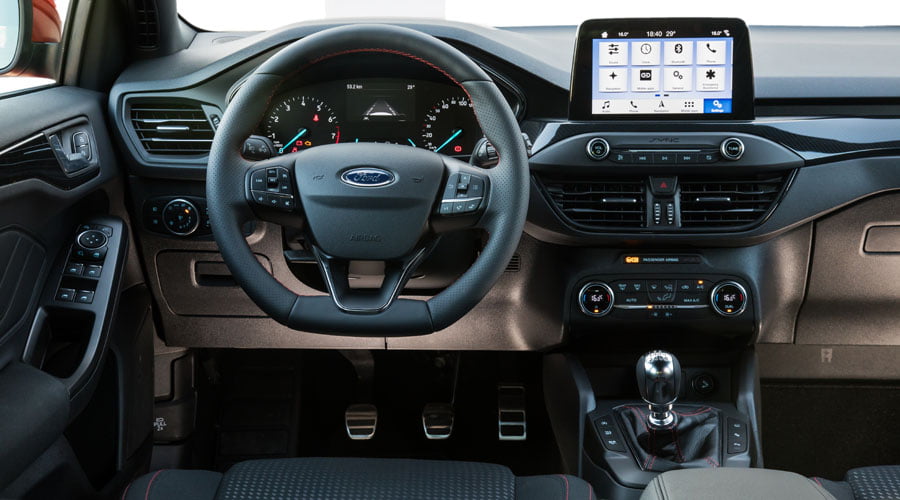 Πλήρως ανασχεδιασμένο είναι και το εσωτερικό του νέου Focus, το οποίο απέκτησε πιο απλούστερη και απέριττη αισθητική και ταυτόχρονα βελτιώθηκε σε ποιότητα και χώρους. Το πάνω τμήμα του ταμπλό στο μεγαλύτερο τμήμα του και τα πάνελ των εμπρός θυρών αποτελούνται από μαλακά υλικά, ενώ τα διακοσμητικά στοιχεία που διαφοροποιούνται ανάλογα την έκδοση το αναβαθμίζουν περεταίρω. Τα επιμέρους χειριστήρια είναι λίγα προς όφελος της εργονομίας, αφού οι περισσότερες λειτουργίες του αυτοκινήτου είναι ενσωματωμένες στη γνώριμη από το Fiesta κεντρική οθόνη αφής των 8 ιντσών.