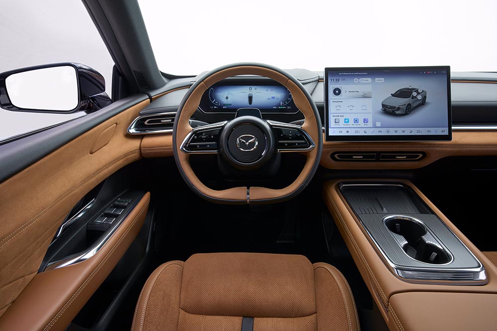 Εξίσου εντυπωσιακό είναι και το εσωτερικό του νέου Mazda6e, όπου κυριαρχούν η πολυτέλεια, η υψηλή τεχνολογία και ο αρμονικός σχεδιασμός. Στο κέντρο του ταμπλό φιλοξενείται η μεγάλη οθόνη αφής των 14,6 ιντσών του συστήματος πολυμέσων, στην οποία συγκεντρώνονται όλες οι λειτουργίες του αυτοκινήτου, αφού πέρα από τους διακόπτες για τα ηλεκτρικά παράθυρα δεν υπάρχουν άλλα φυσικά χειριστήρια. Όπως έχουμε δει και σε άλλα σύγχρονα αυτοκίνητα, μέχρι και για τη ρύθμιση των καθρεπτών θα πρέπει ο οδηγός να ανατρέξει στο infotainment. Πίσω από το τιμόνι είναι τοποθετημένο ένα ψηφιακό καντράν 10,2 ιντσών, ενώ στο παρμπρίζ προβάλλονται με σαφήνεια διάφορες ενδείξεις μέσω του Head-up display. Η προσοχή στην πολυτέλεια και στη λεπτομέρεια είναι έκδηλη σε κάθε σπιθαμή της καμπίνας, χωρίς όμως να δημιουργείται μια «βαριά» ατμόσφαιρα. Πολλές επιφάνειες του ταμπλό, των θυρών και της κονσόλας καλύπτονται από μαλακά υλικά, ενώ οι επενδύσεις σουέτ σε καφέ απόχρωση του ταιριάζουν ιδανικά. Οι χώροι για τους επιβάτες είναι αναμενόμενα άνετοι, αφού και στο πίσω κάθισμα οι πιο ψηλοί έχουν στη διάθεσή τους πολύ αέρα για τα πόδια. Το πορτ μπαγκάζ με το τετραγωνισμένο σχήμα έχει χωρητικότητα 466 λίτρα (μαζί με το αποθηκευτικό τμήμα κάτω από το δάπεδο), συν του ότι το μεγάλο άνοιγμα της 5ης πόρτας διευκολύνει πολύ. Κάτω από το εμπρός καπό υπάρχουν άλλα 72 λίτρα του frunk.