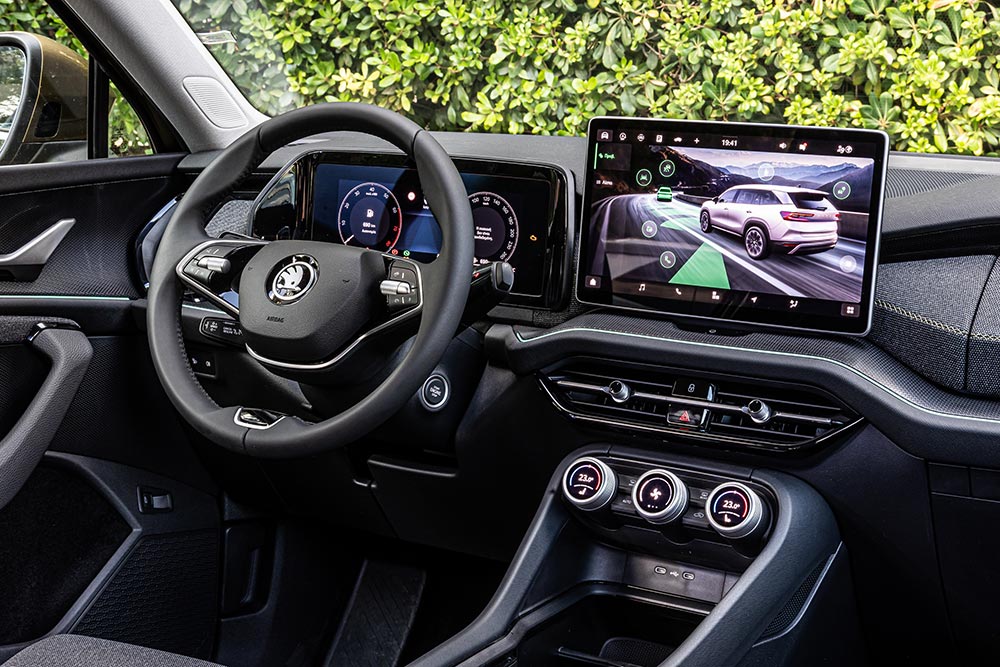 Το νέο Skoda Kodiaq διαθέτει ένα πλήρως επανασχεδιασμένο εσωτερικό, καλύπτοντας τον οδηγό και τους επιβάτες σε όλα τα επίπεδα. Στο κέντρο του ταμπλό κυριαρχεί η οθόνη infotainment που φτάνει τις 13 ίντσες και κάτω αυτή βρίσκονται τα νέα έξυπνα χειριστήρια Skoda Smart Dials. Πρόκειται για περιστροφικά χειριστήρια με έγχρωμη οθόνη 32 χιλιοστών και απτική ανάδραση, προσφέροντας εύκολη πρόσβαση σε διάφορες λειτουργίες του αυτοκινήτου, του ηχοσυστήματος και του συστήματος πλοήγησης. Για πρώτη φορά στο μεγάλο SUV της Skoda, είναι διαθέσιμη μια head-up οθόνη που συμπληρώνει το Virtual Cockpit των 10 ιντσών με νέα γραφικά. Πρόσθετα, ο επιλογέας ταχυτήτων είναι πλέον τοποθετημένος στην κολόνα του τιμονιού, όπως έχουμε δει και σε νέα μοντέλα της VW.