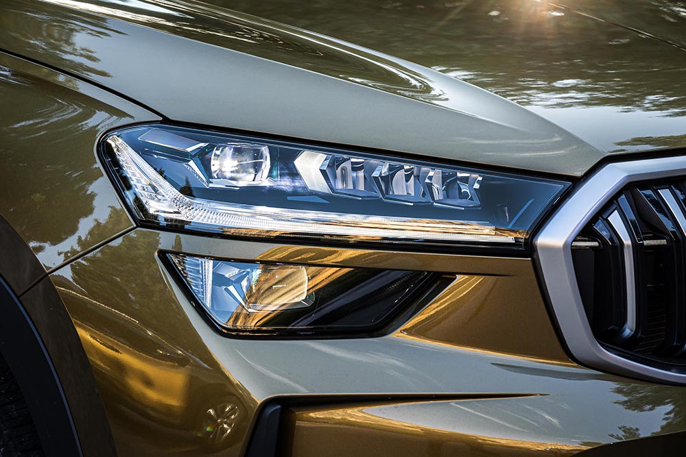 Το νέο Kodiaq απέκτησε πιο κομψές γραμμές και αποπνέει περισσότερη πολυτέλεια. Μπροστά η διπλή διάταξη των φωτιστικών σωμάτων διατηρείται, όμως τα LED είναι πιο λεπτά. Στην πλατιά μάσκα εφάπτονται τα στενόμακρα φώτα, ενώ ο κεντρικός αεραγωγός και τα νεύρα στο καπό προσθέτουν τόνους δυναμισμού. Κάτω από τη μάσκα υπάρχει μια μεγάλη εισαγωγή αέρα με κυψελοειδή δομή που πλαισιώνεται από τις δύο μικρότερες εισαγωγές Air Curtains. Ένα άλλο σημείο αναφοράς αφορά στους προαιρετικούς, δεύτερης γενιάς, προβολείς LED Matrix με 50% περισσότερα φωτεινά στοιχεία και ισχυρότερη φωτεινή απόδοση. Συνδυάζονται επίσης με μια οριζόντια φωτεινή λωρίδα στη μάσκα. Τα προαιρετικά πίσω φώτα LED με δυναμικά φλας διαθέτουν μια κόκκινη διακοσμητική λωρίδα με κρυσταλλική δομή που συνδέει τα δύο φώτα μεταξύ τους. Επίσης, τα πίσω φώτα χωρίζονται σε τρία τμήματα, με αιχμηρή σχεδίαση και επίσης με κρυσταλλικά στοιχεία. Νέο προαιρετικό στοιχείο αφορά τις πίσω κολόνες σε σκουρόχρωμο φινίρισμα για πιο premium εμφάνιση. Πολύ σημαντικό είναι ότι ο συντελεστής οπισθέλκουσας έχει μειωθεί στο Cd: 0,282, παρότι πρόκειται για ένα ογκώδες SUV. Το νέο Kodiaq μεγάλωσε και άλλο σε μήκος κατά 61 χλστ., φτάνοντας τα 4.758 χλστ. Το μεταξόνιο παρέμεινε στα 2.791 χλστ., όπως επίσης το πλάτος στα 1.864 χλστ. και το ύψος στα 1.657 χλστ.