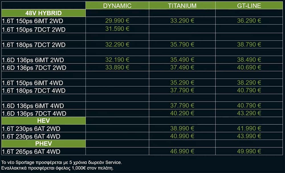 Το νέο Kia Sportage ξεκινά την «καριέρα» του στην ελληνική αγορά αποκλειστικά με εξηλεκτρισμένα μοντέλα. Η διαθέσιμη γκάμα αρχίζει με τις ήπια υβριδικές εκδόσεις που αποτελούνται από τον 1.6 T-GDi κινητήρα με ισχύ 150 ίππων ή 180 ίππων και με το ντίζελ 1.6 CRDi, με απόδοση 136 ίππων. Όλες αυτές επιλογές είναι διαθέσιμες και με τετρακίνηση. Η πλήρως υβριδική έκδοση του νέου Kia Sportage αποδίδει συνδυαστικά 230 ίππους και προσφέρεται τόσο ως δικίνητη όσο και ως τετρακίνητη, ενώ η Plug-In Hybrid είναι τετρακίνητη με 265 ίππους. Σε αυτό το σημείο να αναφέρουμε πως το νέο Kia Sportage προσφέρεται με 5ετές δωρεάν σέρβις ή εναλλακτικά με όφελος 1.000 ευρώ. Όπως όλα τα μοντέλα Kia, έτσι και το νέο Sportage συνοδεύεται με εγγύηση 7 ετών ή 150.000 χιλιόμετρα για τα μηχανικά του μέρη. Αναλυτικότερα οι τιμές στον πίνακα που ακολουθούν: