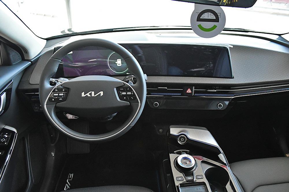 Στο εσωτερικό του νέου EV6 γίνεται άμεσα αντιληπτό, ότι προτεραιότητα των ανθρώπων της Kia ήταν να προσφέρουν μια καμπίνα που θα είναι άνετη και τεχνολογικά προηγμένη ταυτόχρονα. Και το έπραξαν με το παραπάνω. Αρχικά ο οδηγός θα βολευτεί εύκολα στη θέση του, με το κάθισμα να είναι μαλακό κι άνετο. Οι δυο καμπύλες ευρείες οθόνες των 12,3 ιντσών του πίνακα οργάνων και του infotainment πραγματικά εντυπωσιάζουν. Αμφότερες συνδέονται μοναδικά σαν να είναι ενσωματωμένες γύρω από ένα σώμα από ενισχυμένο κρύσταλλο. Ο περιστροφικός διακόπτης για την επιλογή της εκάστοτε σχέσης μετάδοσης είναι κόσμημα, ενώ η αιωρούμενη κεντρική κονσόλα επιτρέπει την αποθήκευση αντικειμένων κάθε είδους. Η πρόσβαση στις πίσω θέσεις είναι εύκολη υπόθεση χάρη στο μεγάλο άνοιγμα της πόρτας. Επίσης, το επίπεδο πάτωμα διευκολύνει τρομερά όποιον κάτσει στη μέση. Ικανοποιημένοι μείναμε κι από το πορτ μπαγκάζ, τόσο σε ότι αφορά τη χωρητικότητά του (520 λίτρα), όσο και το σχήμα του.