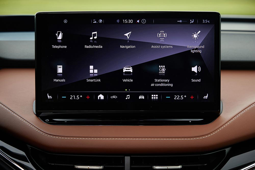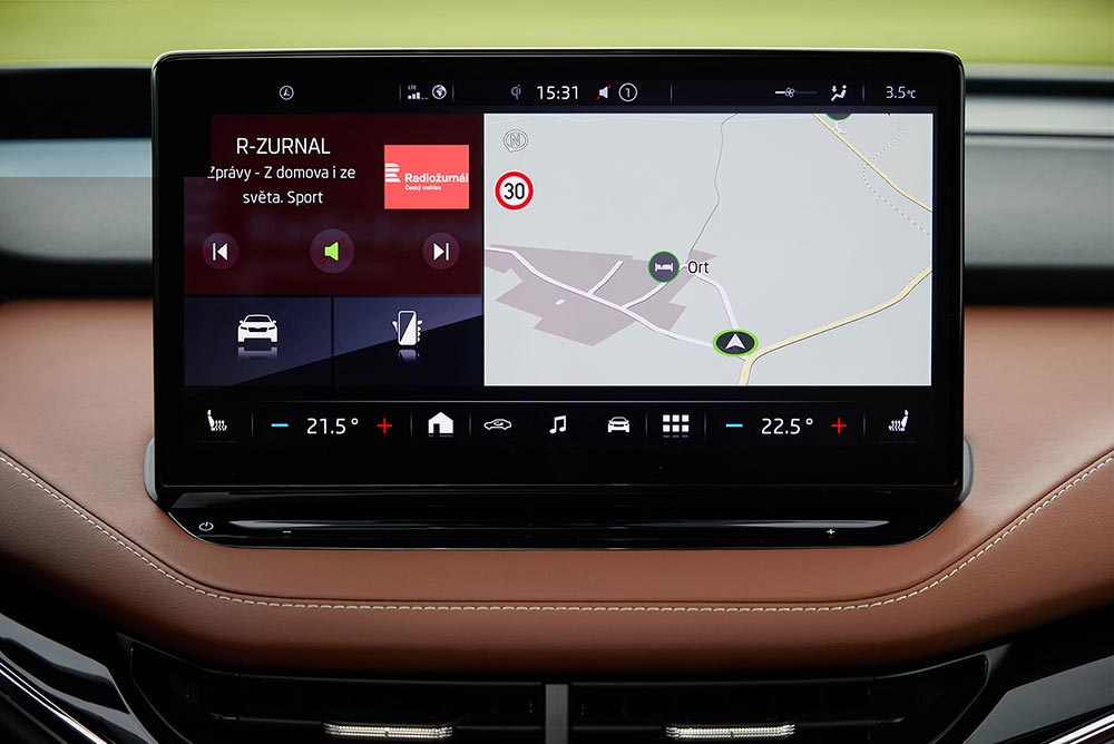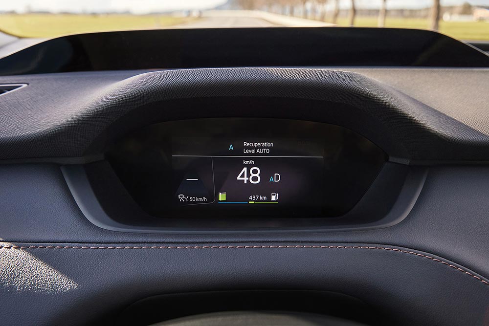 Πολύ θετική είναι η συνολική εικόνα που εισπράττεται και από την καμπίνα του Enyaq iV. Το ταμπλό του εμφανίζει κάποιες ομοιότητες με εκείνο της νέας Octavia και είναι κομψό και σύγχρονο. Ξεχωρίζει η πολύ μεγάλη κεντρική οθόνη του συστήματος infotainment των 10 ή 13 ιντσών, ενώ σύμφωνα με την τάση της εποχής, στην κεντρική κονσόλα είναι τοποθετημένα λίγα φυσικά κουμπιά. Προσεγμένα είναι με την σειρά τους και τα υλικά κατασκευής, με μαλακές επενδύσεις στο ταμπλό και στις πόρτες. Στο βασικό εξοπλισμό ανήκει ο ψηφιακός πίνακας οργάνων με την οθόνη των 5,3 ιντσών, όπου προβάλλονται βασικές ενδείξεις για το αυτοκίνητο. Άλλωστε όλες οι λειτουργίες του αυτοκινήτου προβάλλονται και ελέγχονται μέσω του infotainment. Νέο στοιχείο στο εσωτερικό, του Enyaq iV αποτελούν τα Design Selections για τη διαμόρφωση της καμπίνας, αντικαθιστώντας τα κλασσικά επίπεδα επένδυσης και ικανοποιώντας κάθε γούστο και ανάγκη. Ενδεικτικά υπάρχουν το Studio (βασικός εξοπλισμός στο 50), το σύγχρονο και άνετο Loft, το βιώσιμο και πρωτοποριακό Lodge, το εξελιγμένο και αποκλειστικό Lounge, το κλασάτο και πολυτελές Suite και το πολυτελές και οικολογικό Ecosuite. Μεταξύ των επιλογών θα είναι οι επενδύσεις καθισμάτων από 40% μαλλί και την σφραγίδα της Woolmark και το υπόλοιπο 60% θα είναι ένα μείγμα πολυεστέρα από ανακυκλωμένες φιάλες PET.