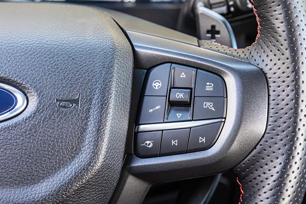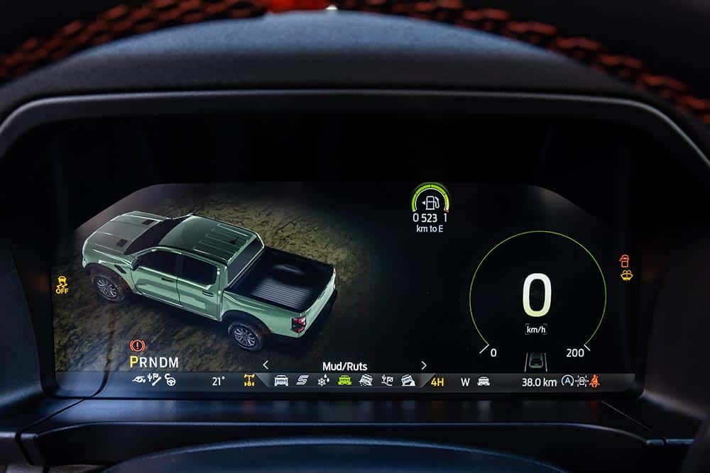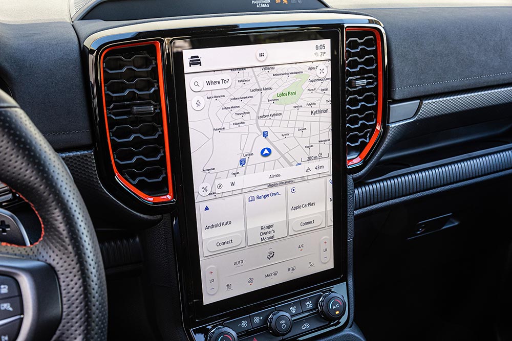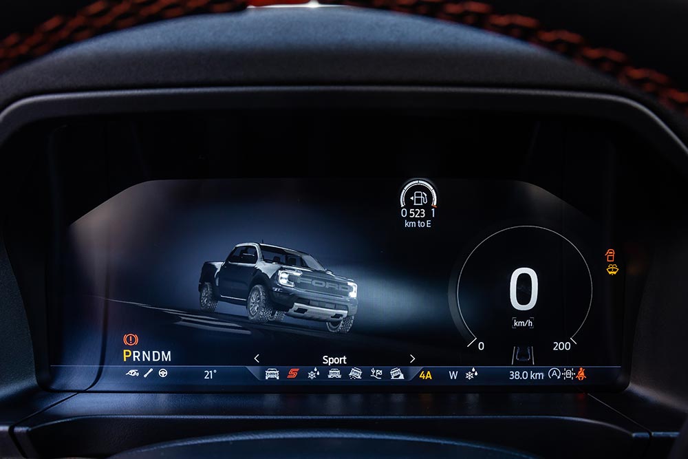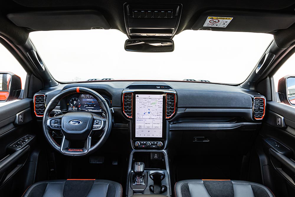 Τα «αγροτικά» αυτοκίνητα έχουν και αυτά εξελιχθεί πολύ τα τελευταία χρόνια και δεν έχουν να ζηλέψουν κάτι σε ανέσεις, εξοπλισμό και τεχνολογίες από τα αμιγώς επιβατικά. Κάτι που είναι έκδηλο και στο Ford Ranger Raptor, όπου κυρίαρχο στοιχείο στο ταμπλό του αποτελεί η μεγάλη κάθετη οθόνη αφής των 12 ιντσών, στην οποία αναγράφονται πάρα πολλές πληροφορίες για το αυτοκίνητο. Ευτυχώς όμως υπάρχουν και τα απαραίτητα φυσικά χειριστήρια για τον έλεγχο του κλιματισμού, των προφίλ οδήγησης και για τις επιλογές της τετρακίνησης. Μοντέρνος και πληρέστατος σε πληροφορίες είναι ο ψηφιακός πίνακας οργάνων των 12,4 ιντσών με τα γραφικά που αλλάζουν, ανάλογα με το drive mode που έχει επιλεχθεί. Στοιχεία που παραπέμπουν σε σπορ κατασκευές είναι τα paddles από μαγνήσιο, οι κόκκινες ραφές και οι προσθήκες σουέτ. Στην καμπίνα του Ranger Raptor θα βολευτούν εύκολα μέχρι πέντε άτομα. Όσο για την καρότσα, έχει μήκος 1.564 χλστ., μέγιστο πλάτος 1.225 χλστ. και βάθος 529 χλστ., ενώ το ωφέλιμο φορτίο είναι 652 κιλά (μεικτό βάρος 3.130 κιλά – καθαρό 2.454 κιλά).