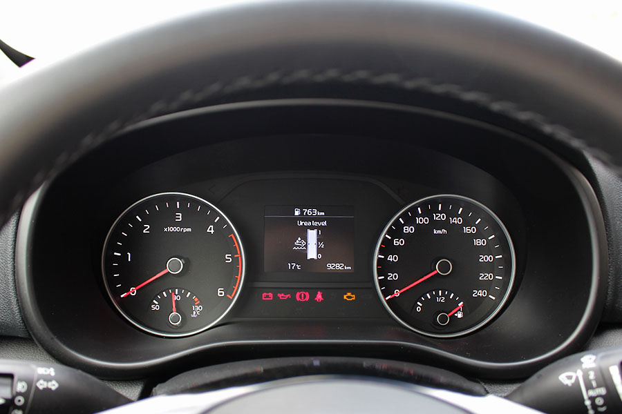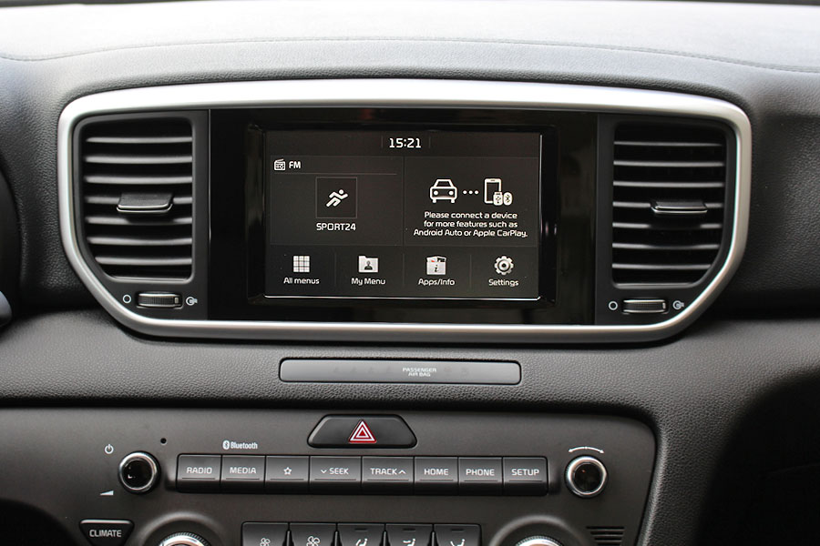 Στην καμπίνα του Sportage οι ευθείες γραμμές και το επίπεδο μοτίβο χαρακτηρίζουν το ταμπλό, όπως και τα μαλακά πλαστικά – αλλά μόνο στο πάνω μέρος του. Από το μέσο και κάτω τα σκληρά υλικά αναλαμβάνουν, δίχως να συνθέτουν το παραμικρό παράπονο από άποψης συναρμογής ή ποιότητας. Η κονσόλα είναι στραμμένη ελαφρά προς τον οδηγό, προσφέροντας αυξημένη ευκρίνεια στην κεντρική οθόνη και οδηγοκεντρικό χαρακτήρα. Θα θέλαμε, όμως, τα γραφικά να είναι έγχρωμα.