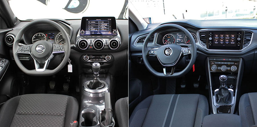 Το Nissan Juke έχει κάνει άλματα προόδου, προσφέροντας σε οδηγό κι επιβάτες μια ποιοτική κι άνετη καμπίνα. Όλα τα ελαττώματα της πρώτης γενιάς είναι πλέον ιστορία, με ποιοτικά μαλακά υλικά να απαρτίζουν το μεγαλύτερο τμήμα του ταμπλό. Στο ανώτερο σημείο της, υπάρχει μια εύχρηστη οθόνη αφής των 8 ιντσών, με άμεση απόκριση στις εντολές των δακτύλων. Η σχεδιαστική ταυτότητα στο εσωτερικό του T–Roc είναι αυτή που μας έχει συνηθίσει η μάρκα στα μοντέλα της, με πολλές ευθείες γραμμές, επίπεδες επιφάνειες και πολύ καλή εργονομία. Μοναδική μας ένσταση, η ευρεία χρήση σκληρών πλαστικών στο ταμπλό, αλλά τουλάχιστον η συναρμογή είναι πολύ καλή.